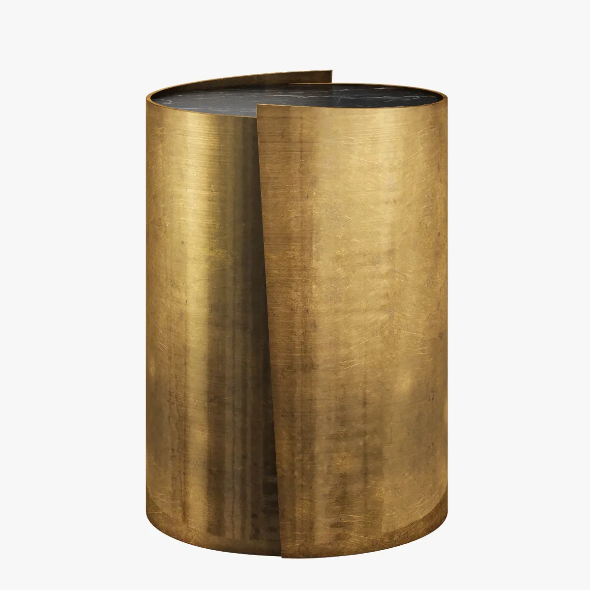 The Alta Coffee Table is an elegant and refined cylindrical solid drum table, composed of a single 1/4th inch brass sheeting. The table is finished in a burnished bronze patina and formed around a single, honed and sealed marble top in Nero Marquina or White Venatino stone. The design features a subtle overlap shape, adding interest and distinction to the quietly iconic silhouette