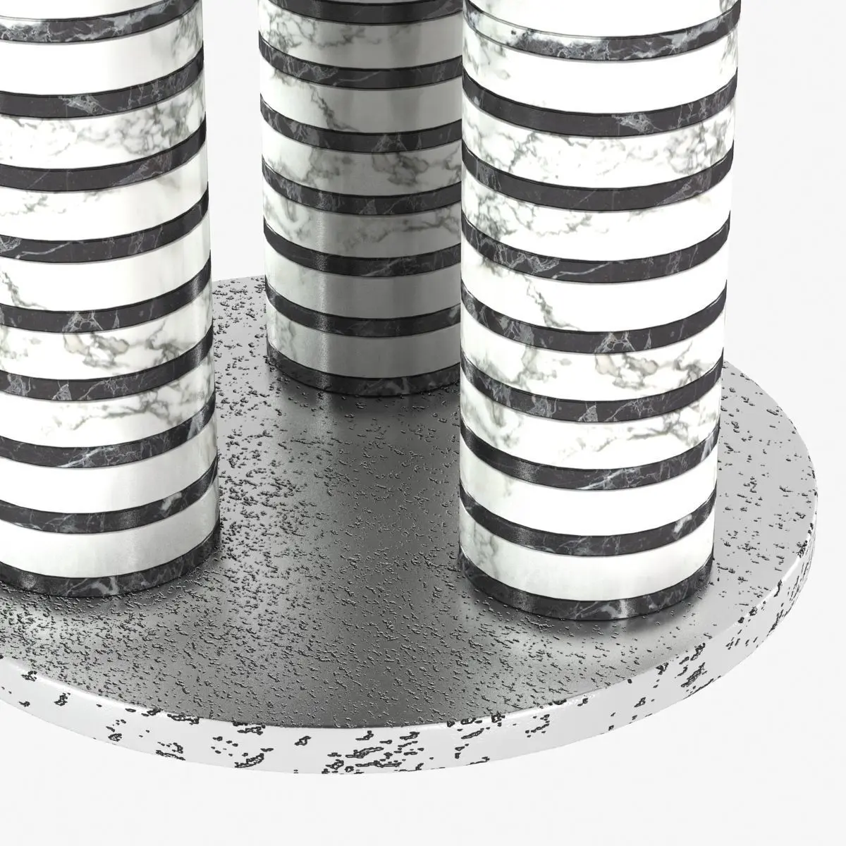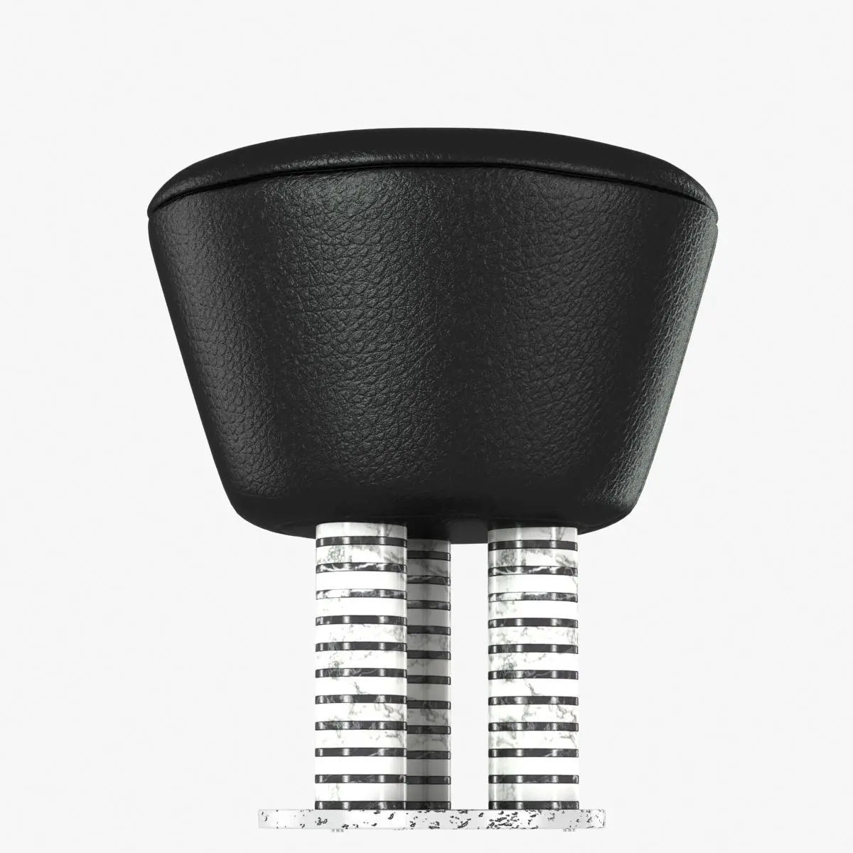 The Leona Stool is a sexy mix of luxurious mixed materials. A trio of negro marquina and absolute white stacked marble columns rest on a solid disc of blackened bronze. The upholstery has an elegant tapered silhouette, and available in a variety of luxurious leathers. Perfect as an ottoman for a vanity or as a decorative accent.18” H x 16” Dia Weight: 45 lbs. Materials: Leather, Marble, Bronze