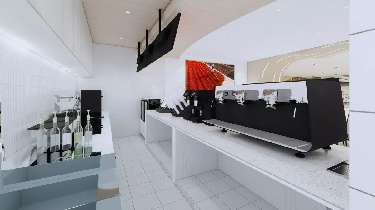 Detailed Coffee Bar: Includes high-quality espresso machines, grinders, POS systems, and takeaway cup stacks.