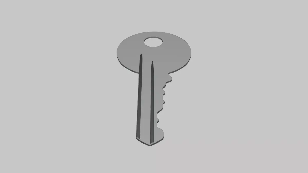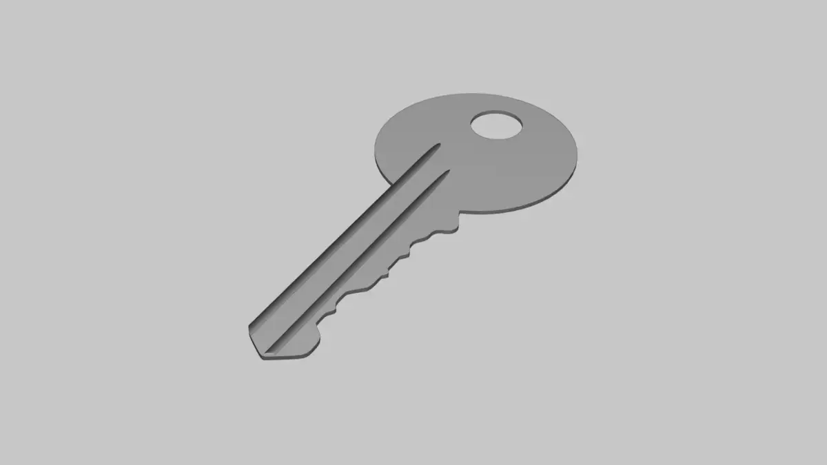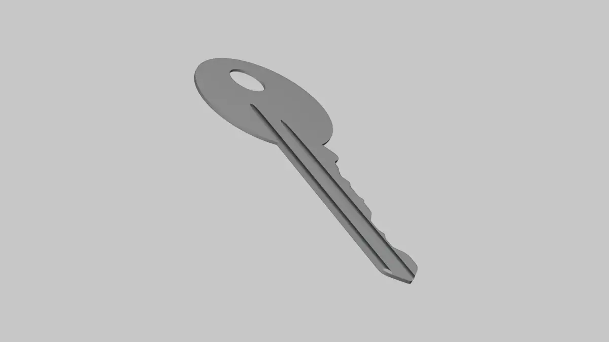 3D model of a standard metal key with clean edges and accurate proportions. Ideal for security visuals, household scenes, keychain mockups, or everyday object renders.