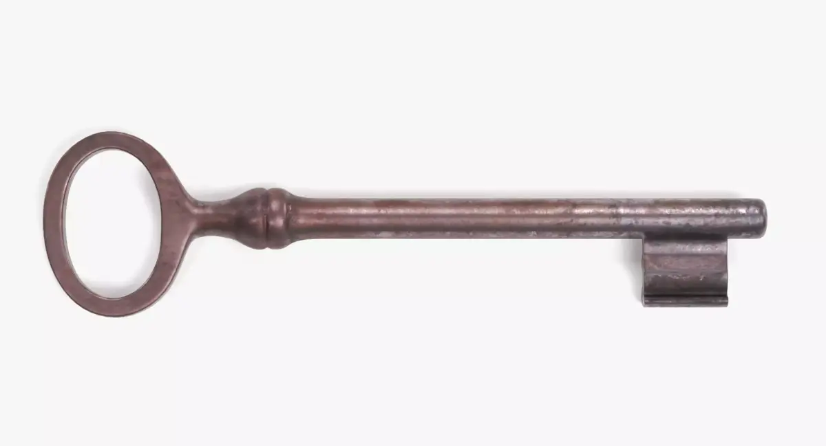 A classic skeleton key defined by a hollow barrel and a distinctly curved bit, shaped to feel functional. The surface is heavily aged, with deep darkening and layered rust that suggest long-term use. Designed as a versatile prop that can naturally fit into historical, fantasy, cinematic, or everyday environments.