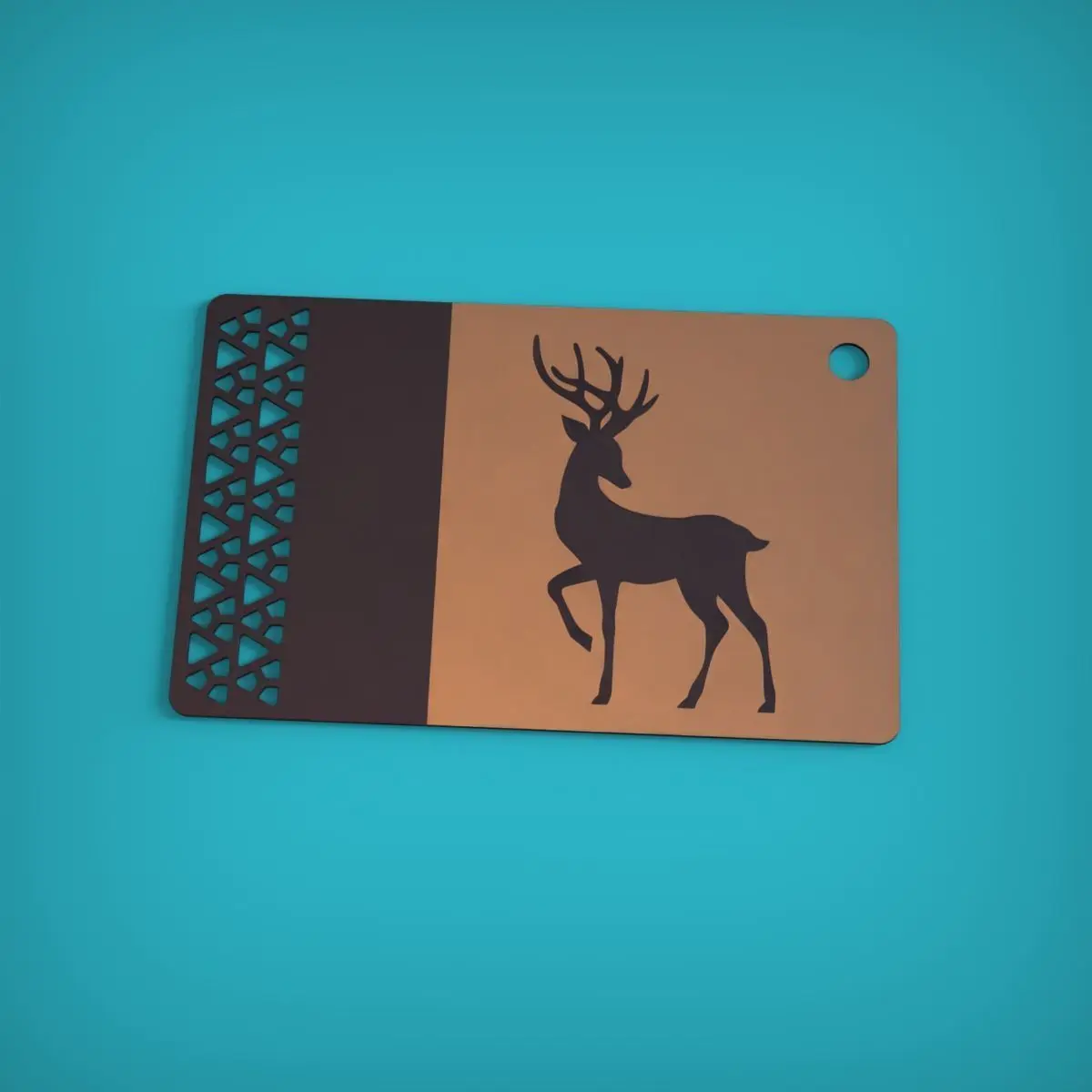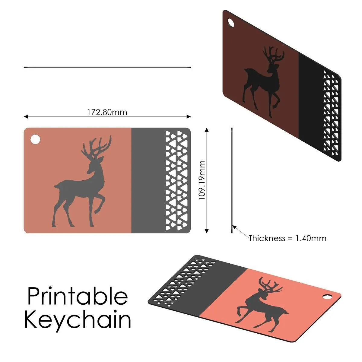 3D printable Keychain model with reindeer silhouette debossed on both sides.