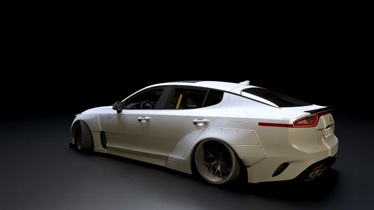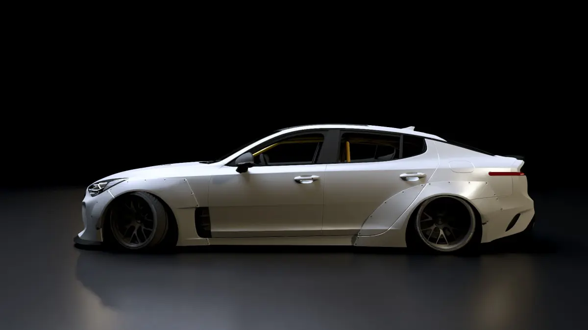 This 3D model showcases a captivating Kia Stinger GT transformed by a comprehensive wide body kit. The original sleek lines of the Stinger GT are amplified by the addition of wider fenders, front and rear bumpers, and side skirts, resulting in a more aggressive and muscular stance.