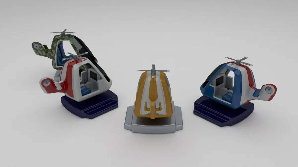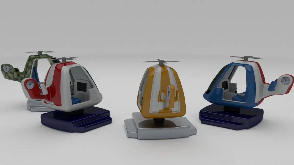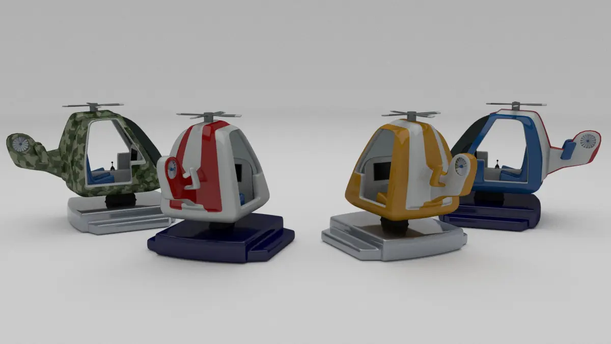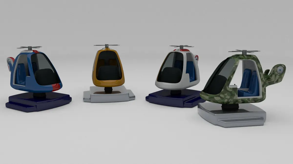 A pack of 4 very accurat Kiddie Ride Helicopters, themed as following:Army/Coast Guard/Police/Ambulance. The model comes in four formats, in three different colors :