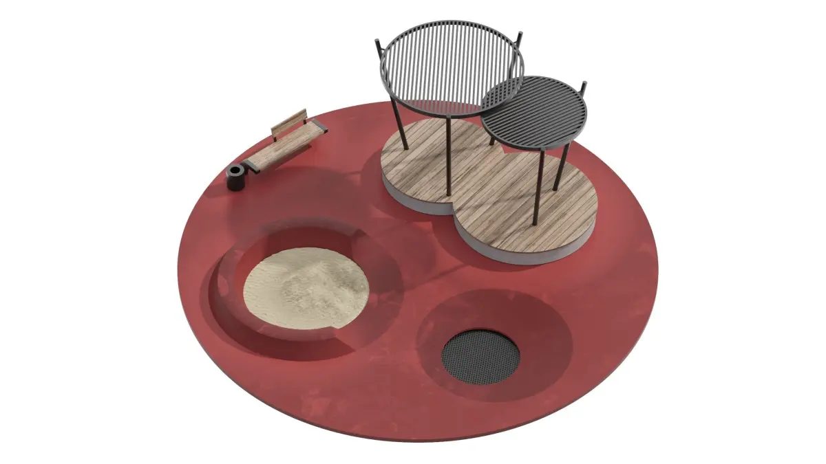 KIds Playground with pergola, sandbox, trampoline and bench, diameter 10m