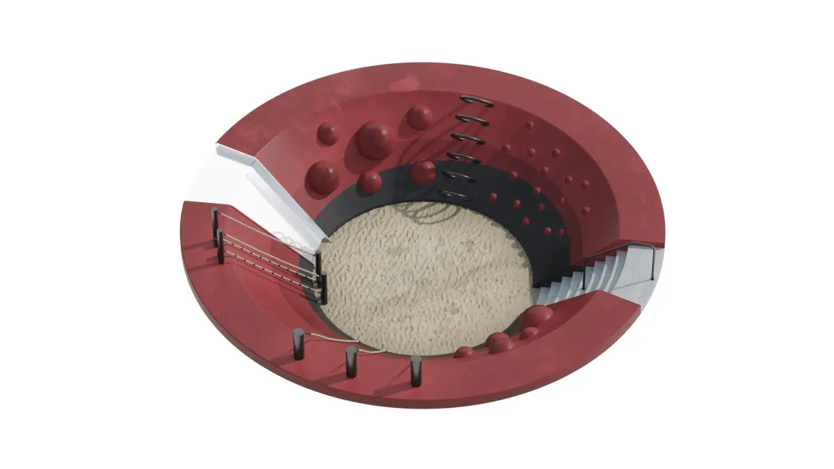Playground with slide, climbing wall, ropes and sandpit, diameter 10m