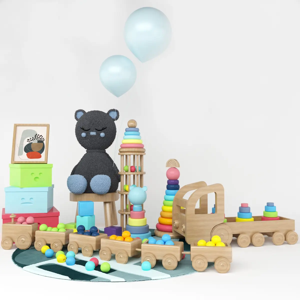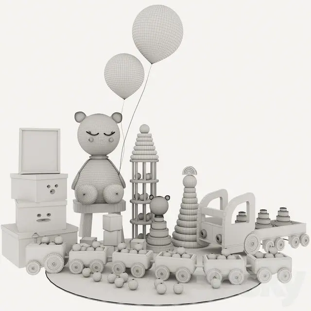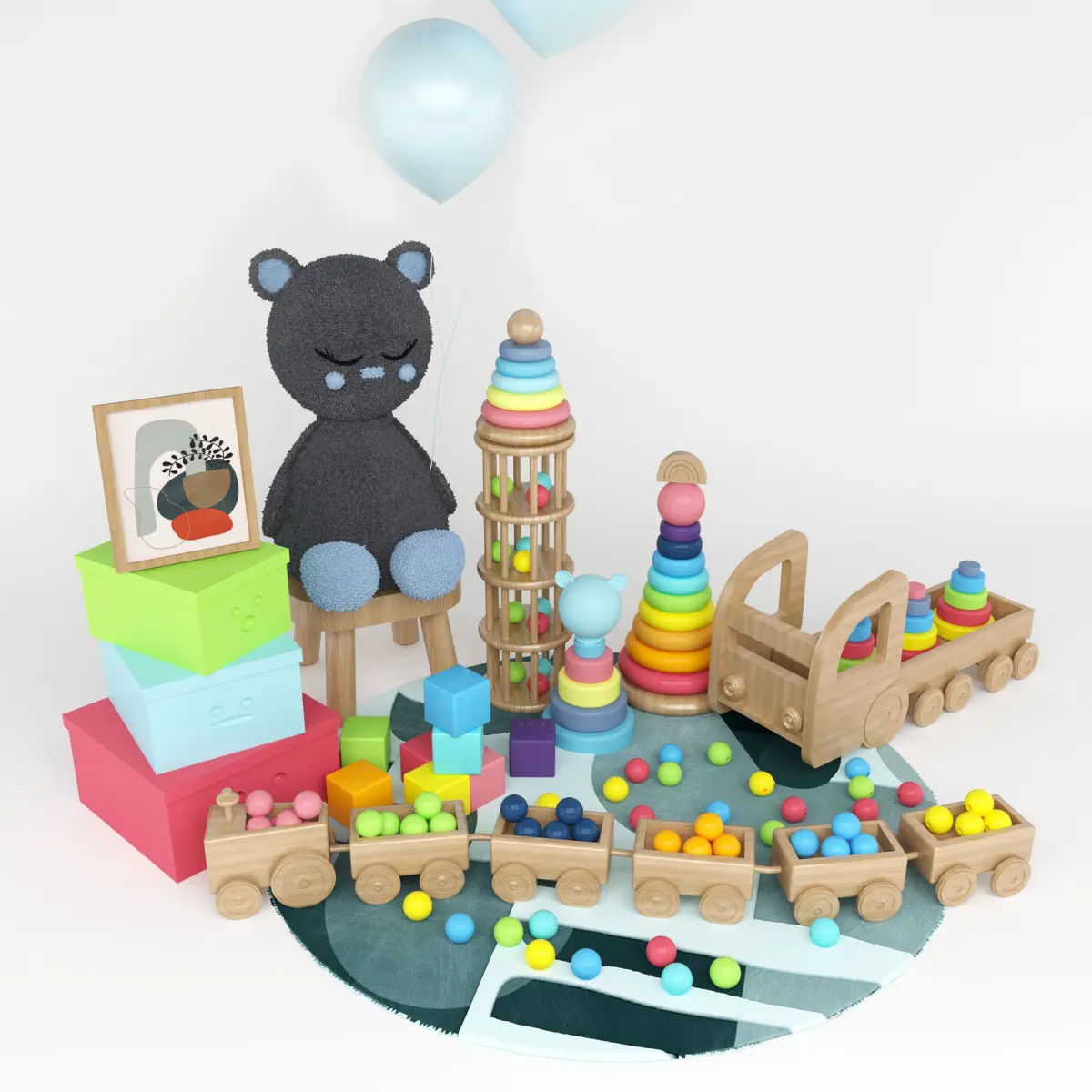 All elements of the model are logically grouped, have unique names.The names of materials and textures correspond to the names of model elements.polys: 164,699verts: 165,331Rendering in corona3.software: 3d max 2013.v-ray 3.40.01. corona 4The scene is built in the metric system (in mm)in the V-Ray version lower than 3.1, be careful, in the materials in the BRDF section is Microfaset GTR (GGX)you can seeLarge Baby Stacking Rings in https://www.crateandbarrel.com/large-baby-stacking-rings/s360632 you can see the chair in https://www.ikea.com/nl/en/p/flisat-childrens-stool-40273593/