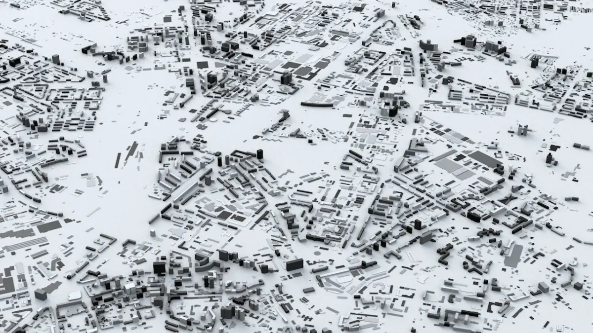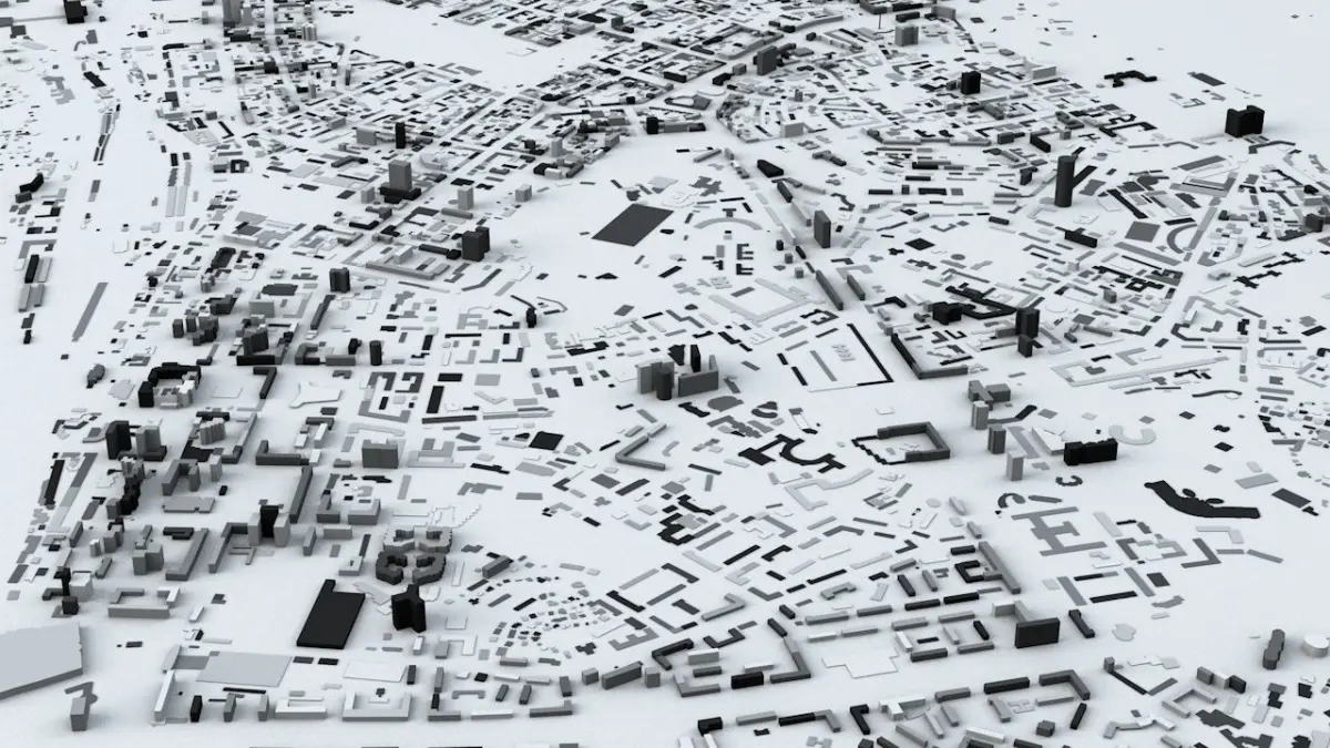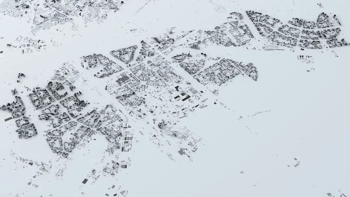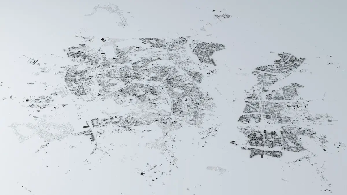 - the model is positioned on a flat surface (all buildings are on the “floor” - no elevation data included)