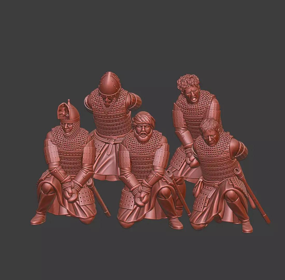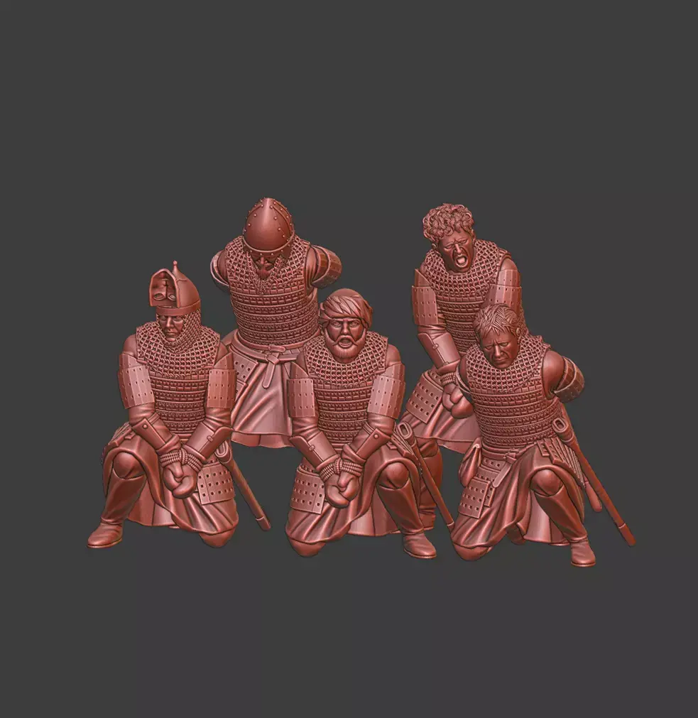 This STL set depicts captured Kievan Rus warriors, bound and kneeling, with expressions of defiance, pain, and resignation. Perfect for use as scenario objectives, diorama storytelling, or adding immersive detail to your tabletop campaigns.