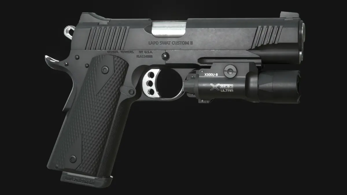 This is the infamous sidearm currently in use by Los Angeles Police Department's Special Weapons and Tactics (LAPD SWAT) team. It entered service from 2002 to present. Since around the 2010s, LAPD SWAT has upgraded their Kimbers to have a picatinny rail frame, which allowed the mounting of flashlights. The SureFire x300 series remain their main flashlight attachment of choice.Interestingly, LAPD SWAT Kimbers feature custom engraved markings on the slide and has a special serial number “KLA114XXX”. KLA stands for “Kimber Los Angeles”, 114 is the police radio SWAT code, and XXX are the 3 unique serial numbers.