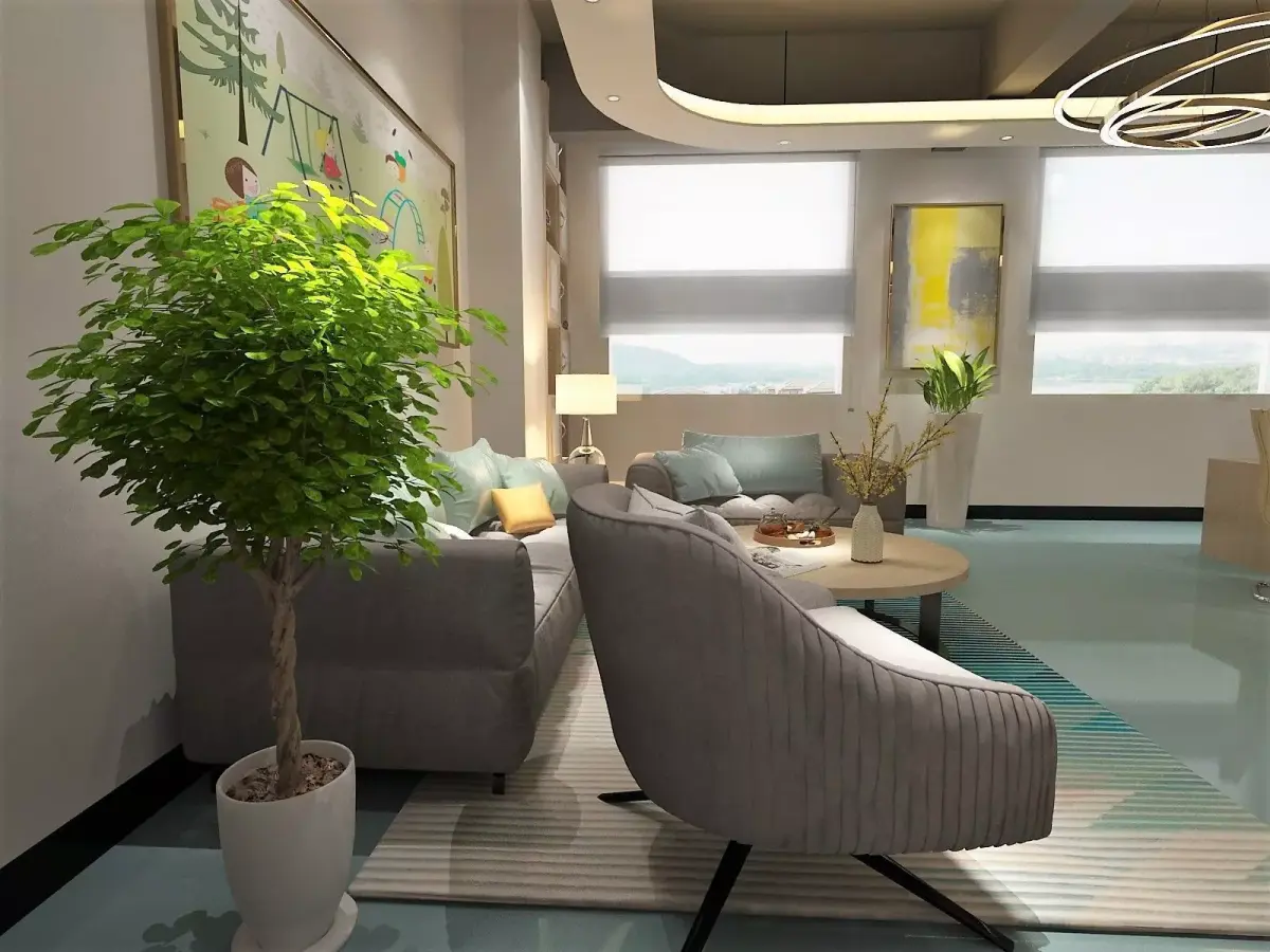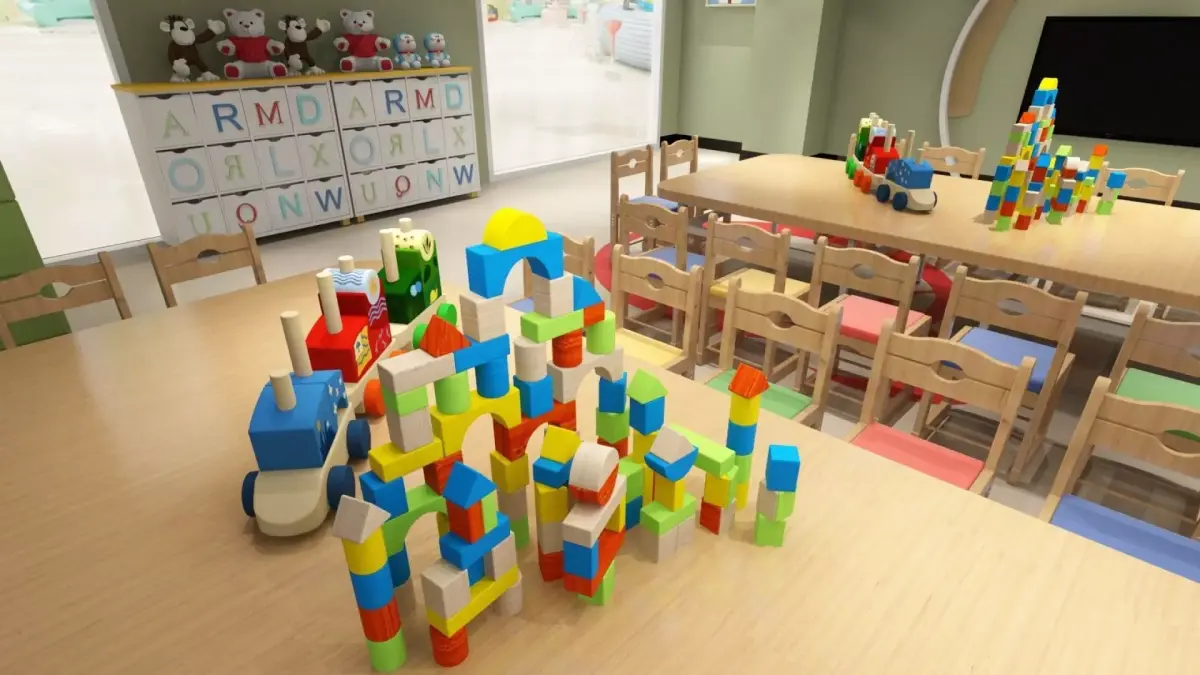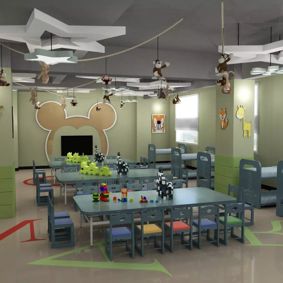 Kindergarden classroom, playground hall and teacher's office. Various decorative items.All naming in English.