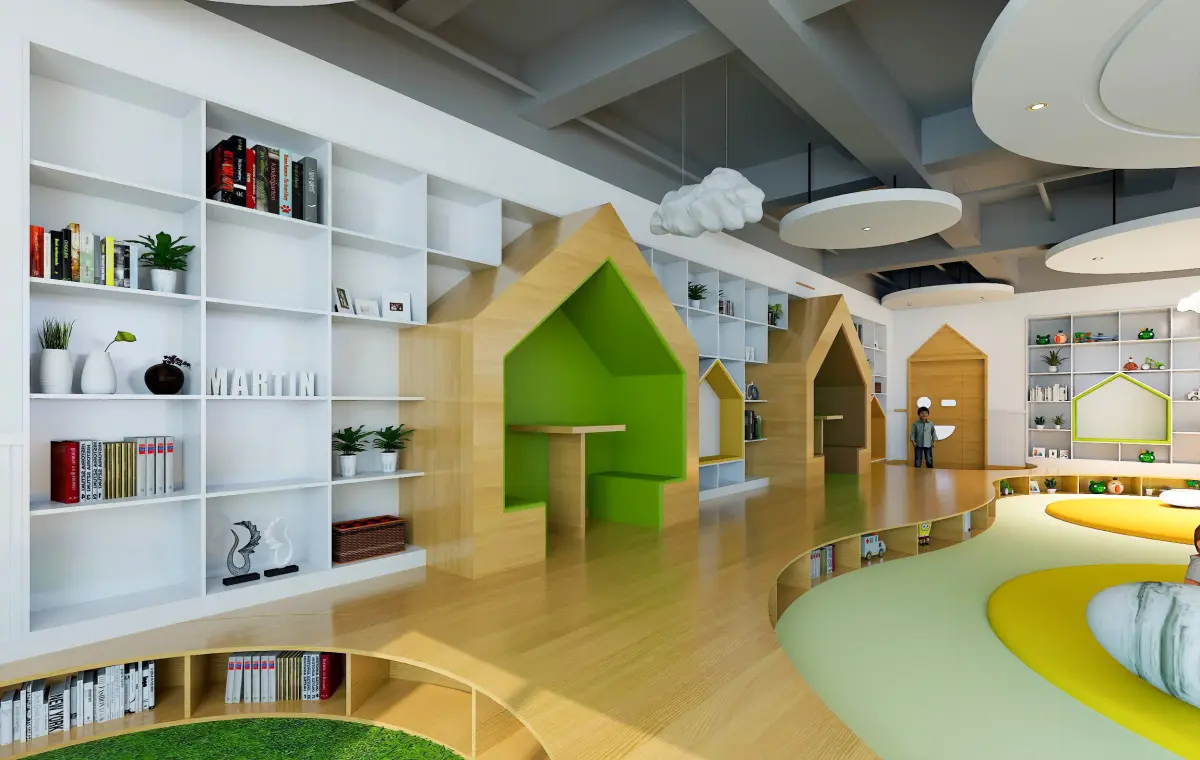 A detailed 3D model of a kindergarten activity room featuring essential elements for early learning environments. This scene includes colorful furniture, interactive play zones, and classroom decor – all carefully modeled with attention to realism and practicality.