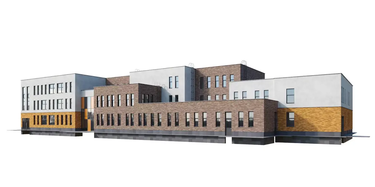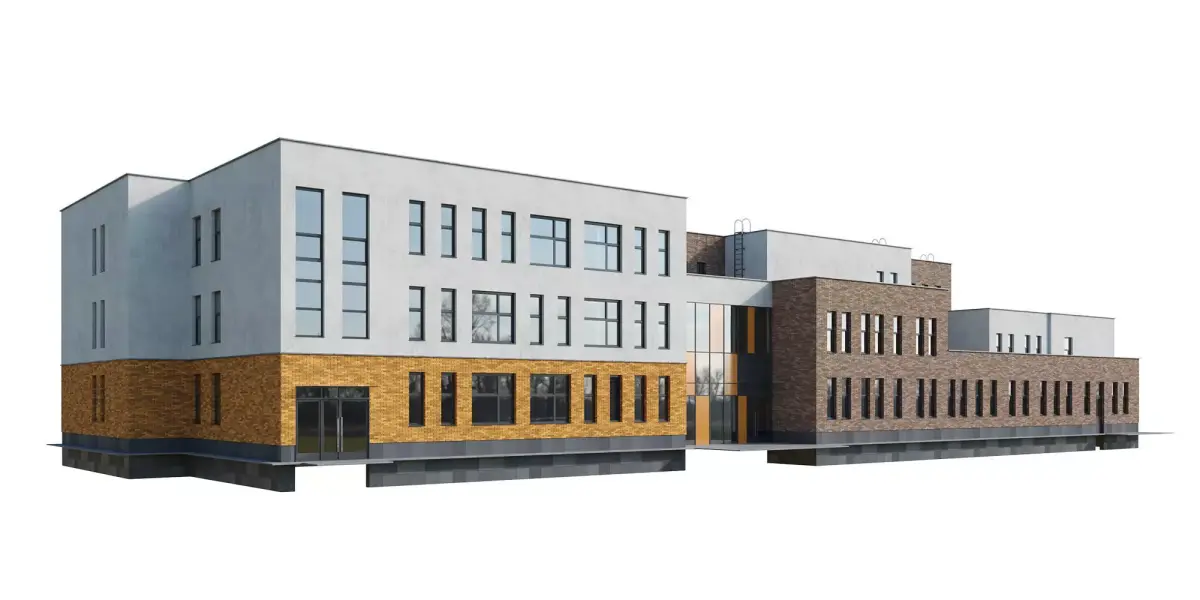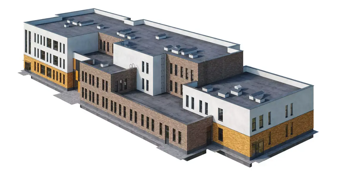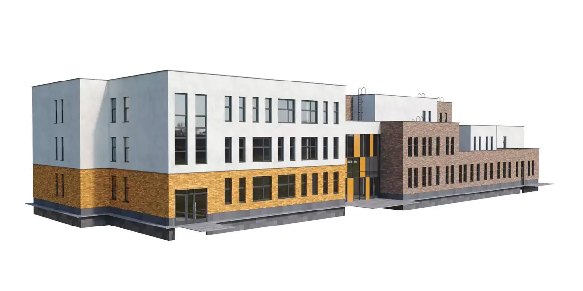 A high-quality model of a modern kindergarten/school building for visualization, featuring a small base for easy placement on the terrain. The model is assembled with maximum detail and precision, at actual dimensions, without the use of any plugins. The mapping stacks are not collapsed, allowing for easy editing as needed.Dimensions of building: length 70,4 meters, width 26,1 meters, height 11,6 meters. Dimensions can be adjusted