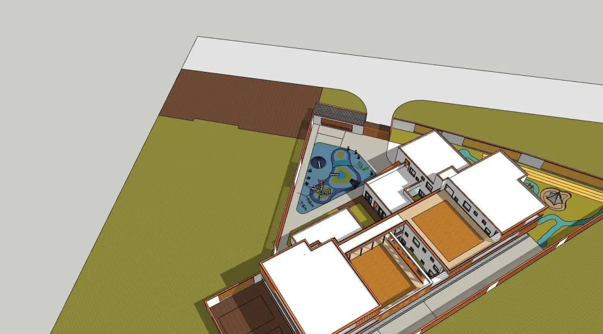 [Kindergarten] This is a modern kindergarten named GREEN WONDERLAND. The design concept is to create a bright, welcoming, and green learning environment. The buildings have a white exterior, large windows, and balconies. The central courtyard has a large blue sculpture, surrounded by trees. The sky is blue and the trees are green, indicating a clear day.