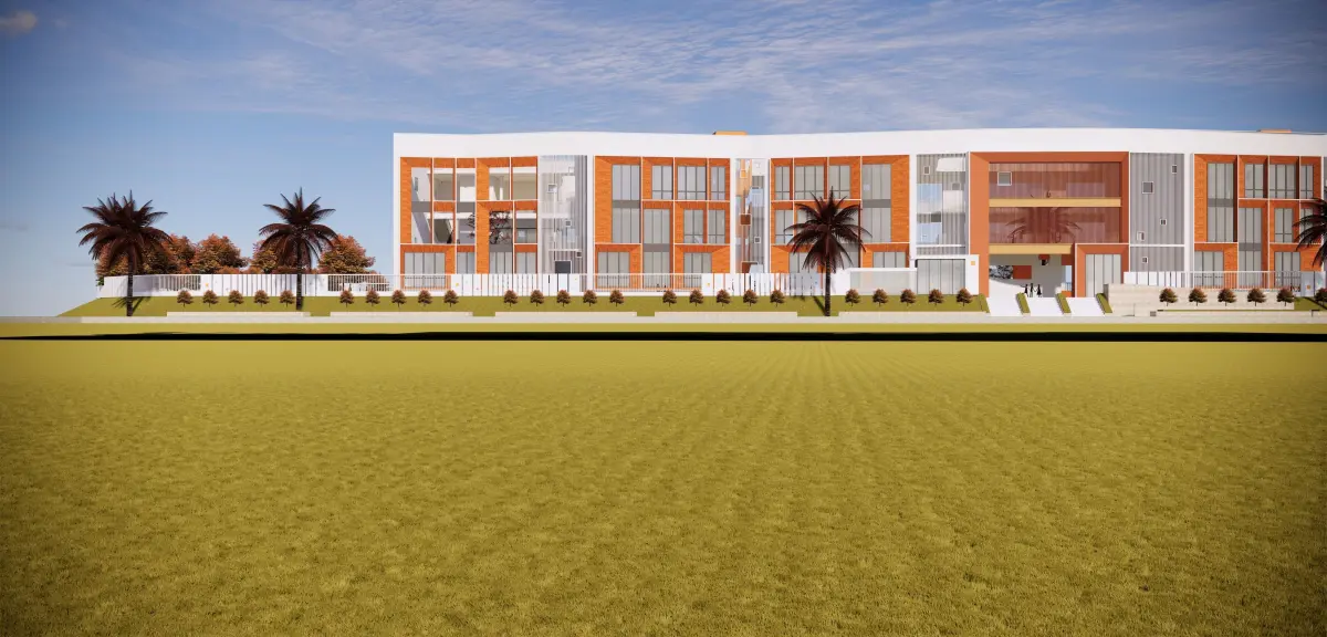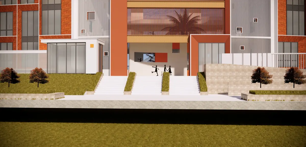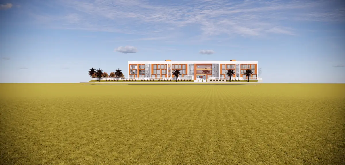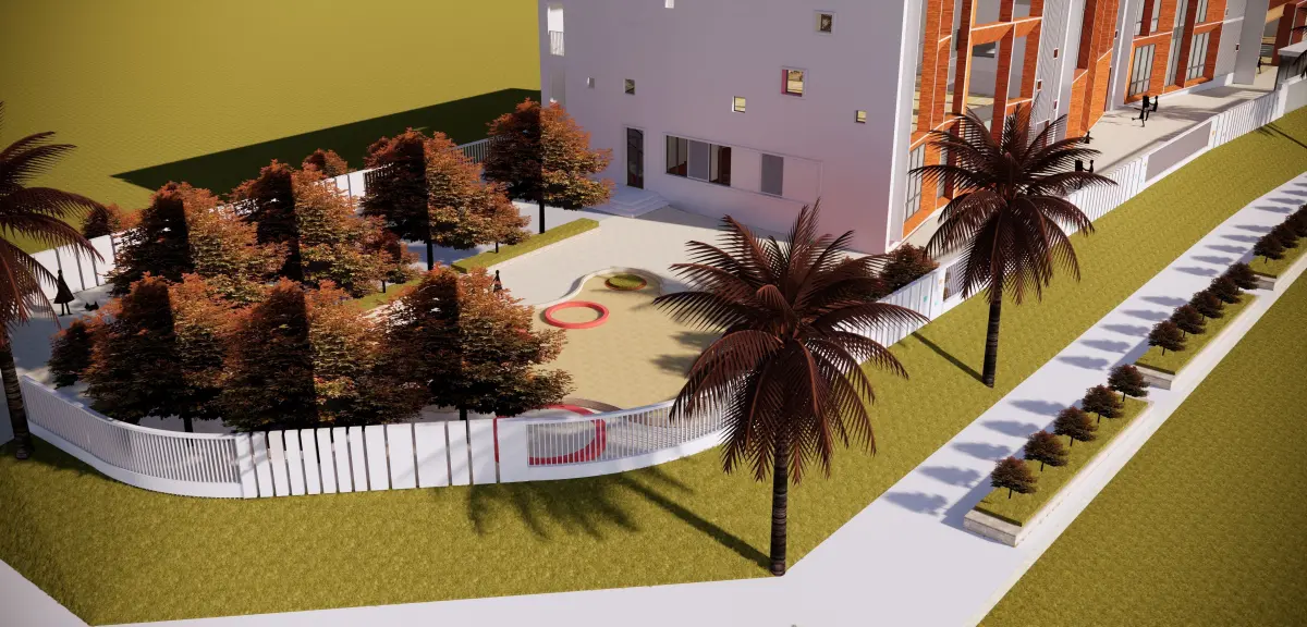 [Kindergarten] This is a modern kindergarten named SUNNY COAST. The design concept is to create a bright, welcoming, and tropical learning environment. The building has a white exterior and wooden accents, and is surrounded by palm trees to create a tropical atmosphere. The building has large windows to let in plenty of sunlight.