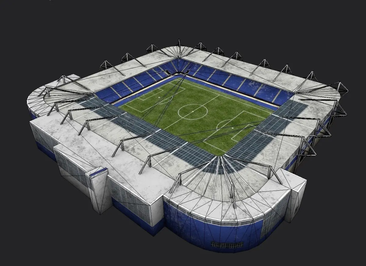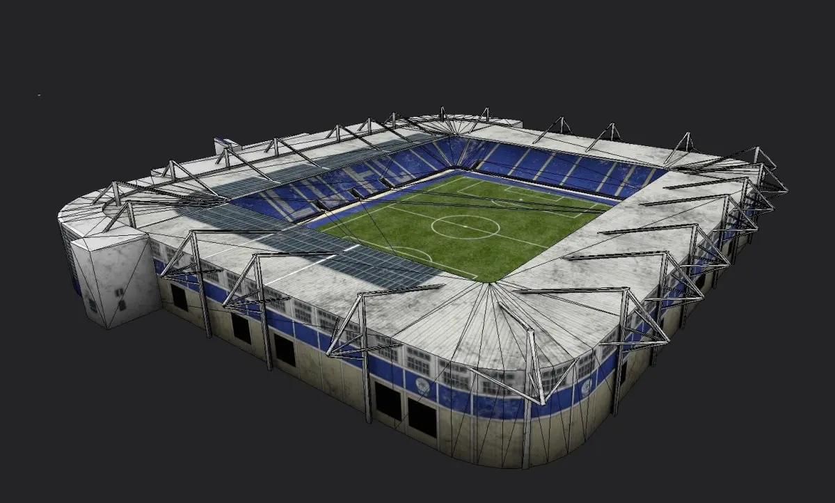 Low poly model of a King Power Stadium, it is non-PBR with 4k resolutions. This is a low poly model with 1094 polys. This is an ideal opportunity to decorate your scene with an object that will be in other plans, and that would be seen from a long distance. All dimensions are by ratio 1:1. The model has 1 daylight mode and 1 night mode map.