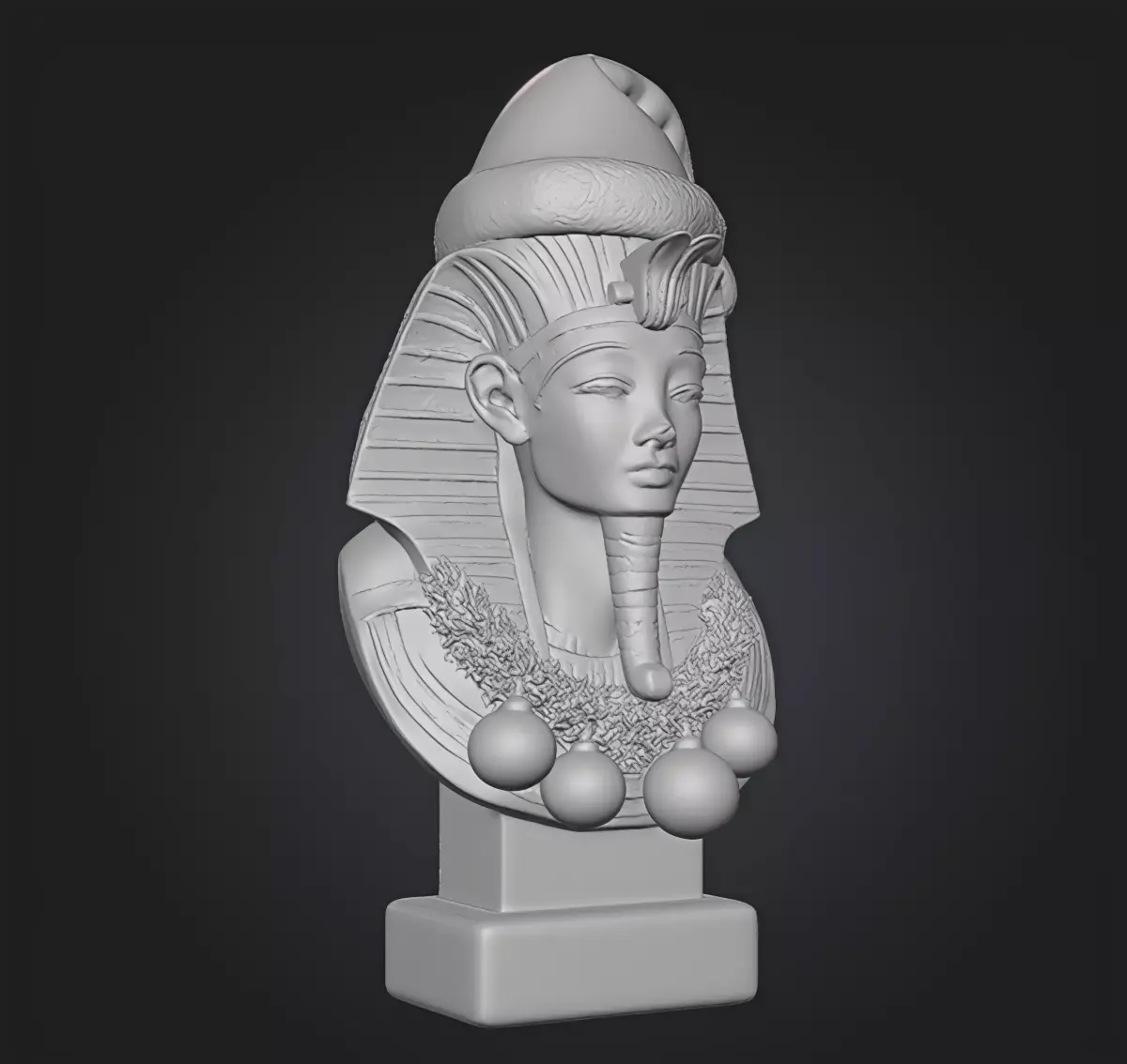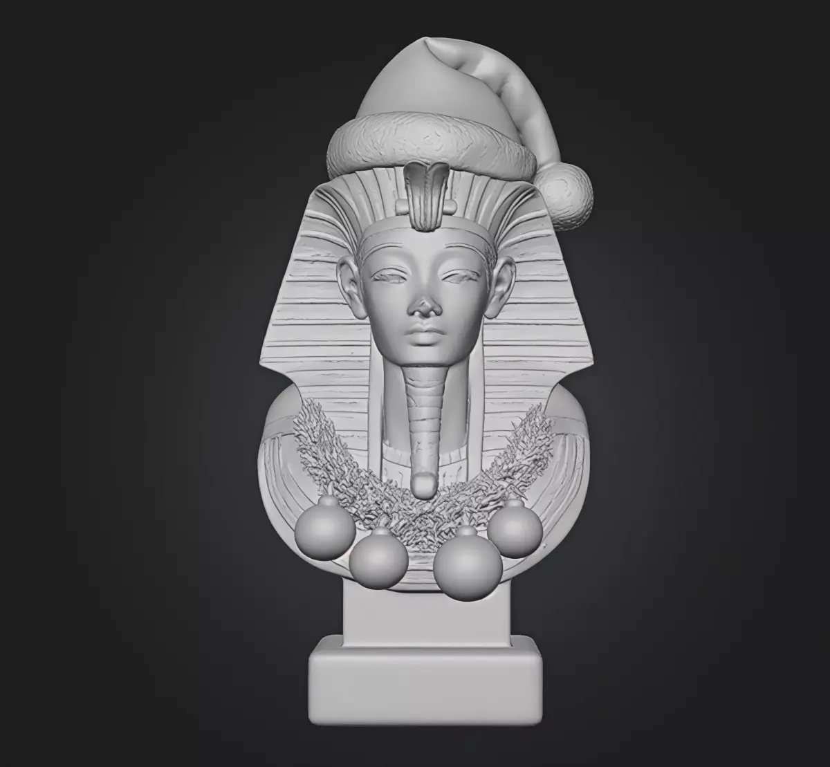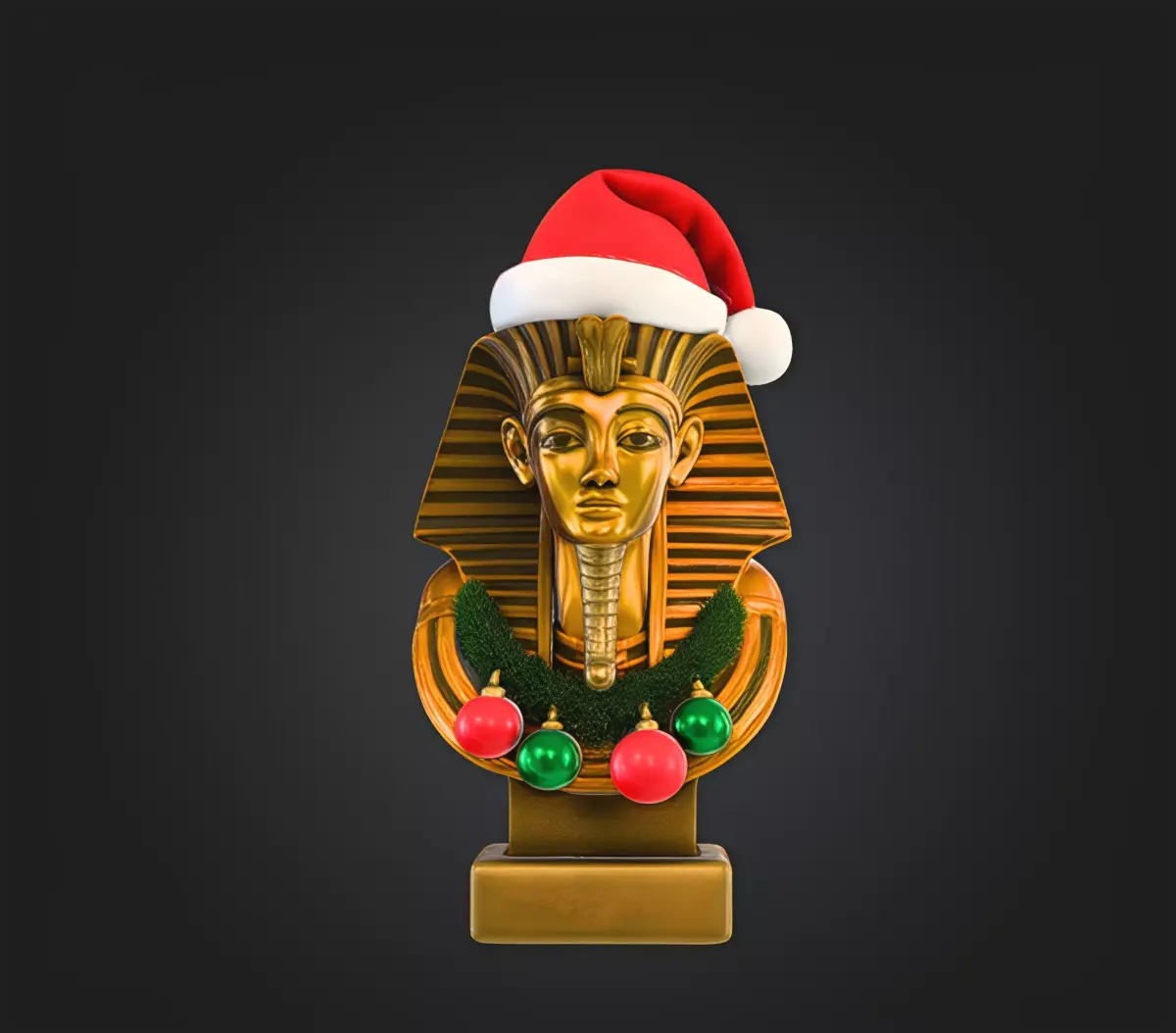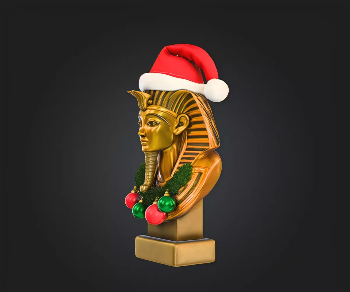 This unique 3D model blends ancient Egyptian royalty with festive holiday cheer. It features a golden bust of Pharaoh Tutankhamun, inspired by his iconic funerary mask, reimagined with joyful Christmas decorations.