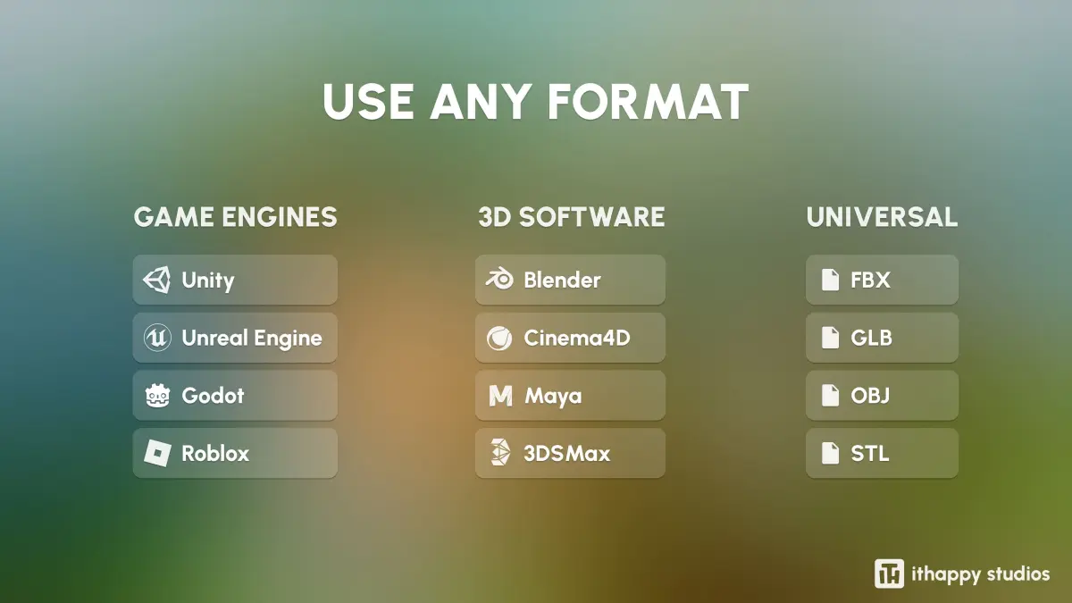 FILESYou’ll be able to download formats such as Unity Package, UE, Blender, C4D, Maya, 3DSMax, FBX, OBJ, GLTF, and STL.