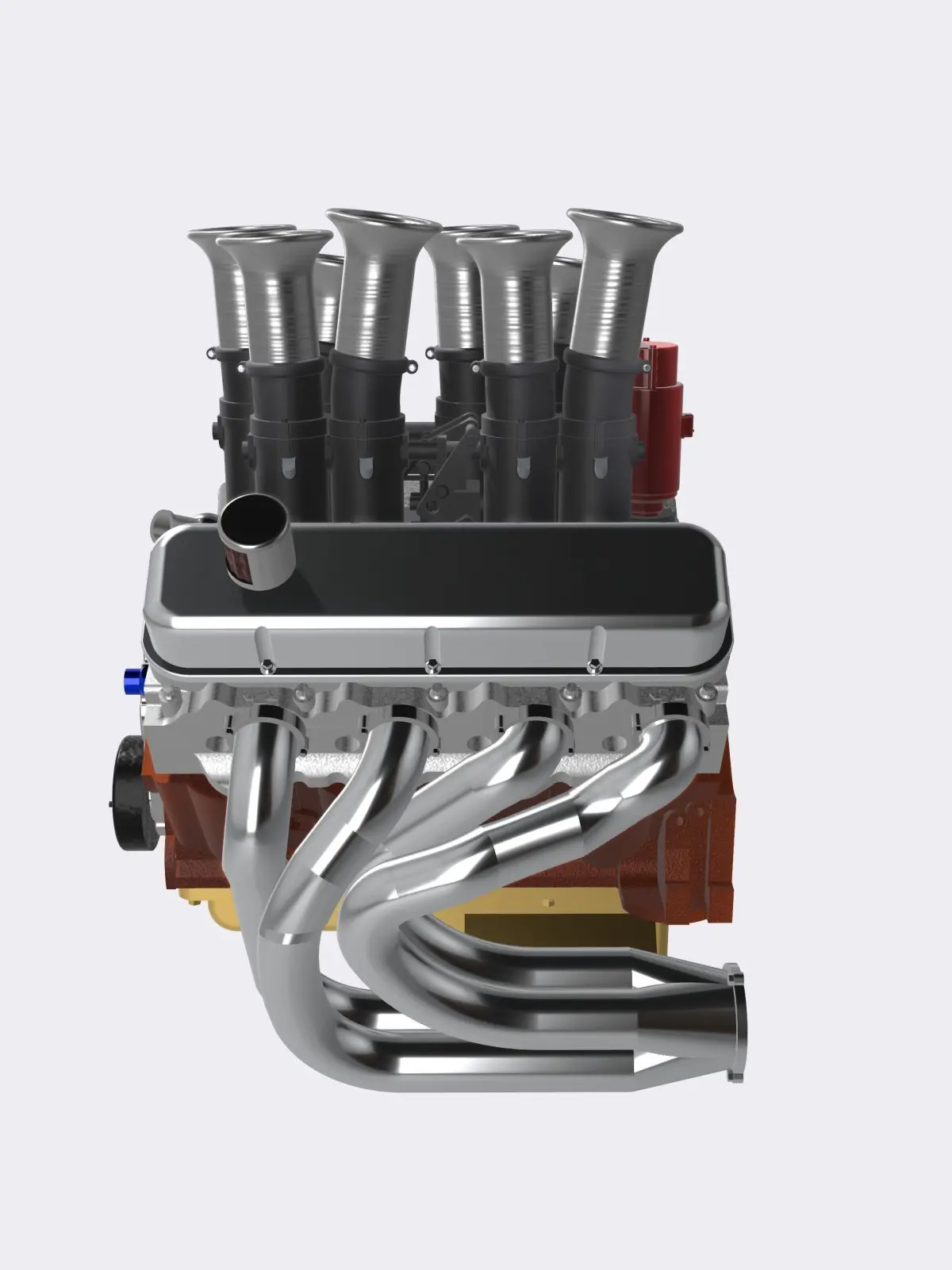 Designed from scratch is a vintage 1960s/1970s Kinsler injected BBC racing engine, with an uneven stacked injection, high in detail, ideal for scale modeling (currently in 1/24 and 1/25 scale).