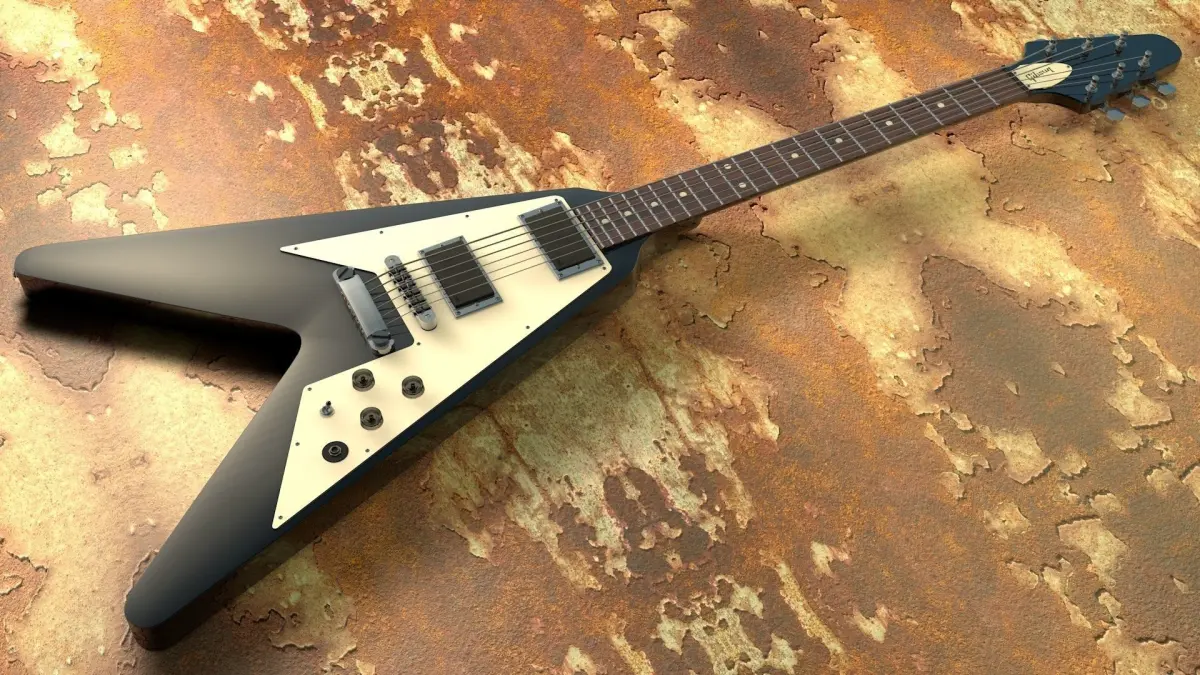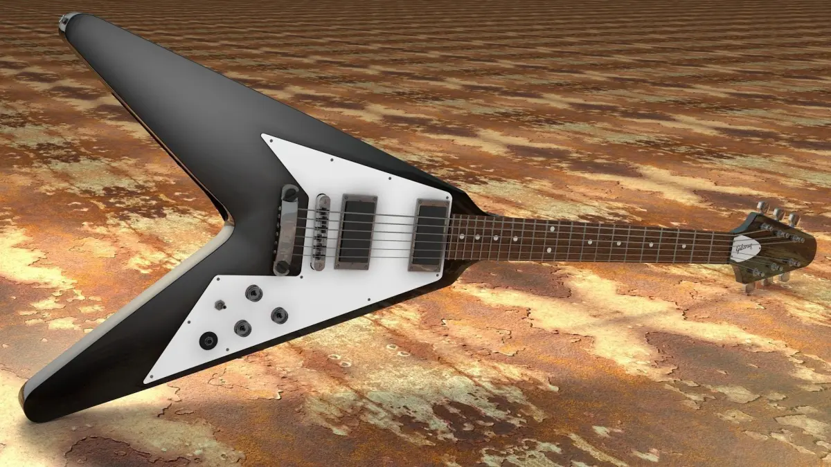 Here is the signature Gibson Kirk Hammett Flying V, with the duct taped back.