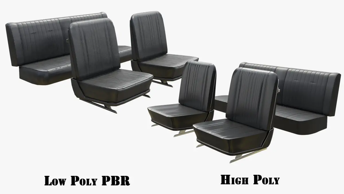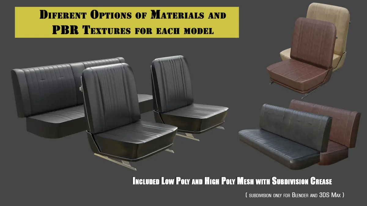 I modeled and created these Seats to Impala 1967, but it's not 100 % similar to original one, so these seats can be use in any classic vehicle because is a very commun design and will add an air of simplicity in any composition of sort.