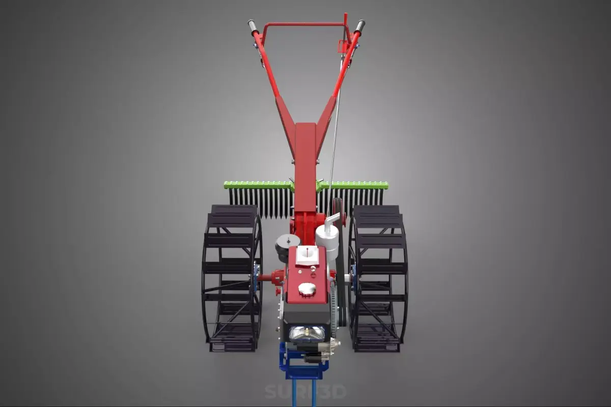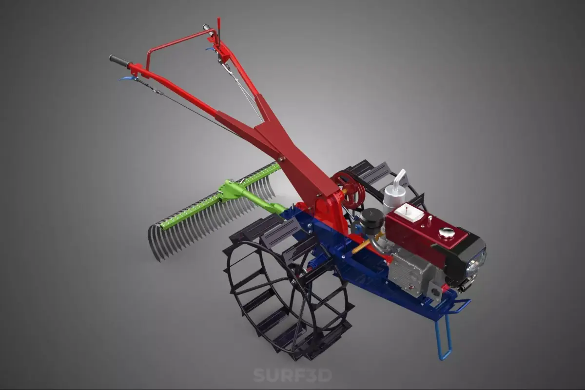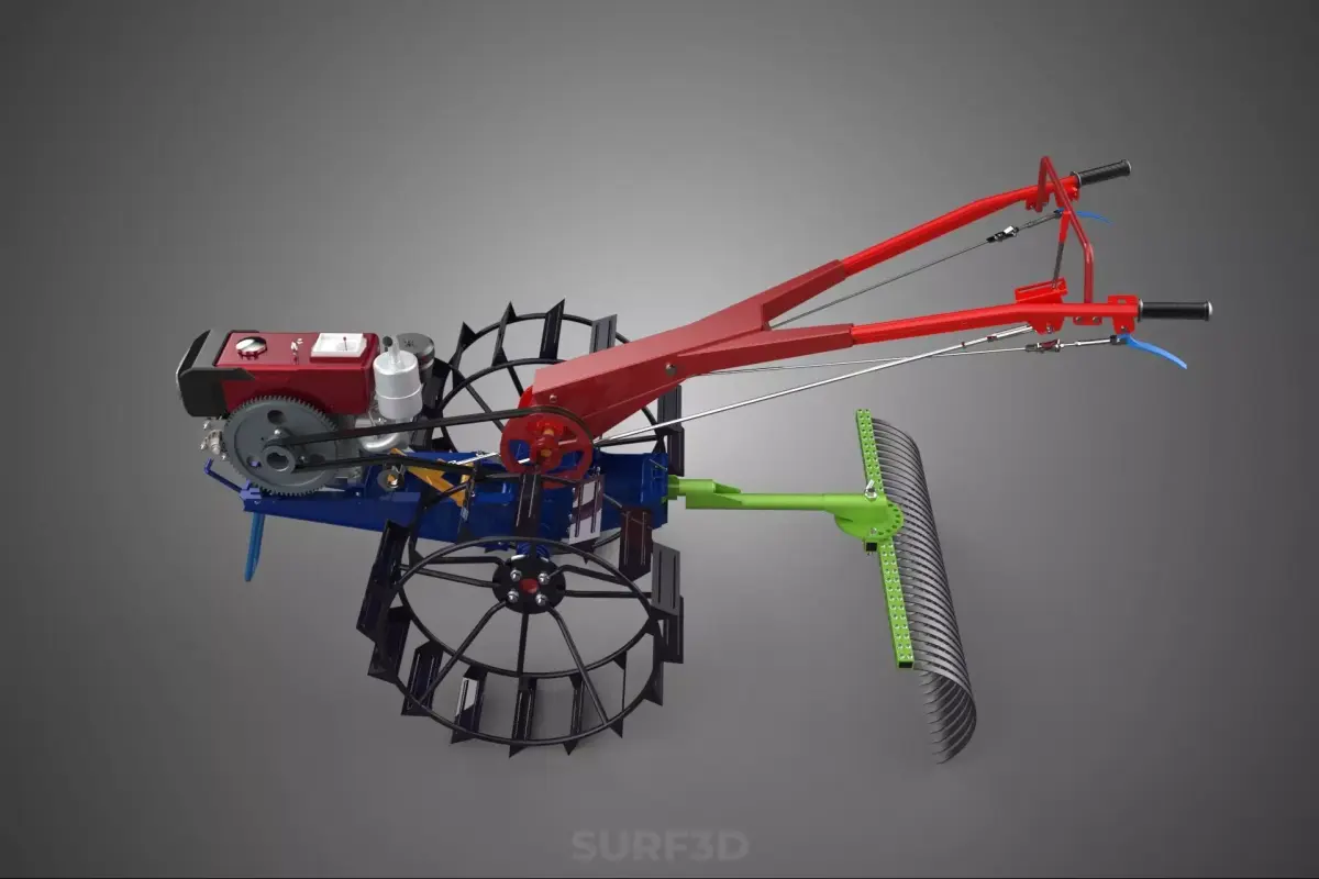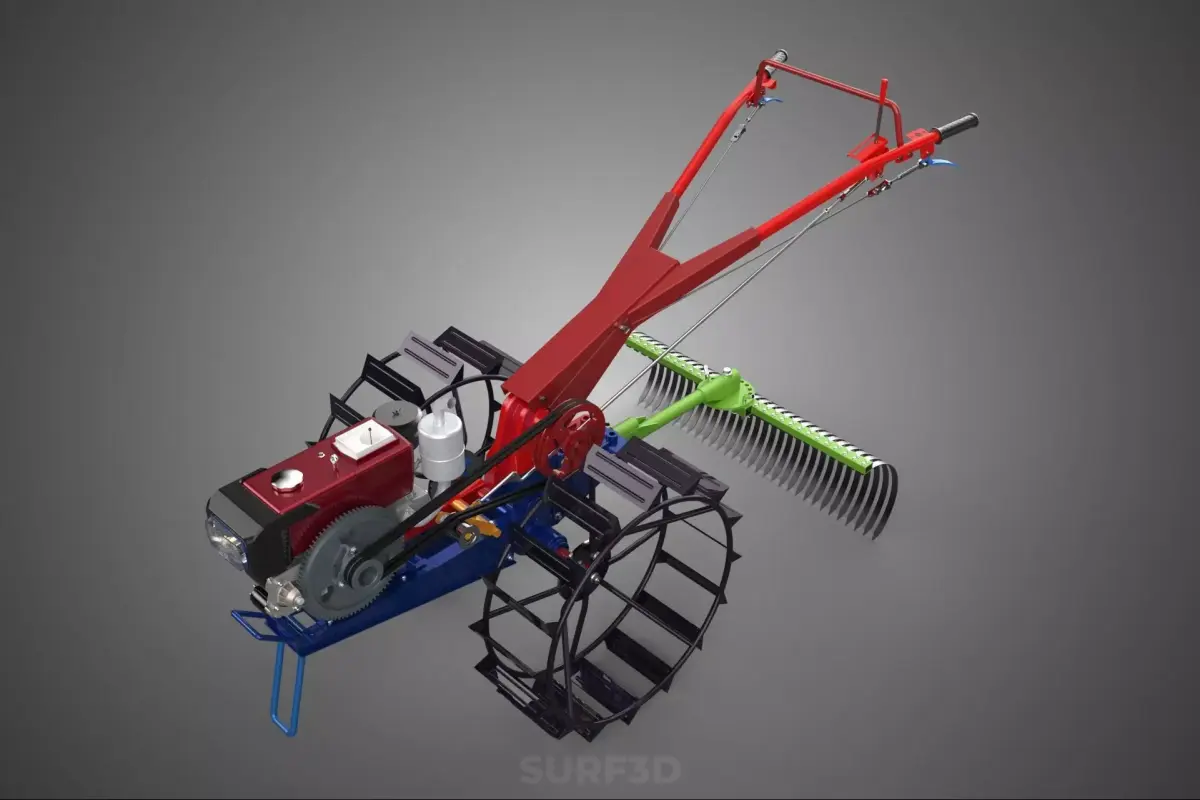 The apparatus described, frequently marketed as a Kit Raker, is a specialized, multi-functional implement designed for integration with a two-wheeled walking tractor, commonly referred to as a hand tractor. This device serves as a primary soil preparation and landscape finishing attachment, combining the capabilities of a landscape rake, a light harrow, and a precision leveling mechanism. It is categorized within agricultural and horticultural machinery as a ground-engaging, passive tillage and grading tool.