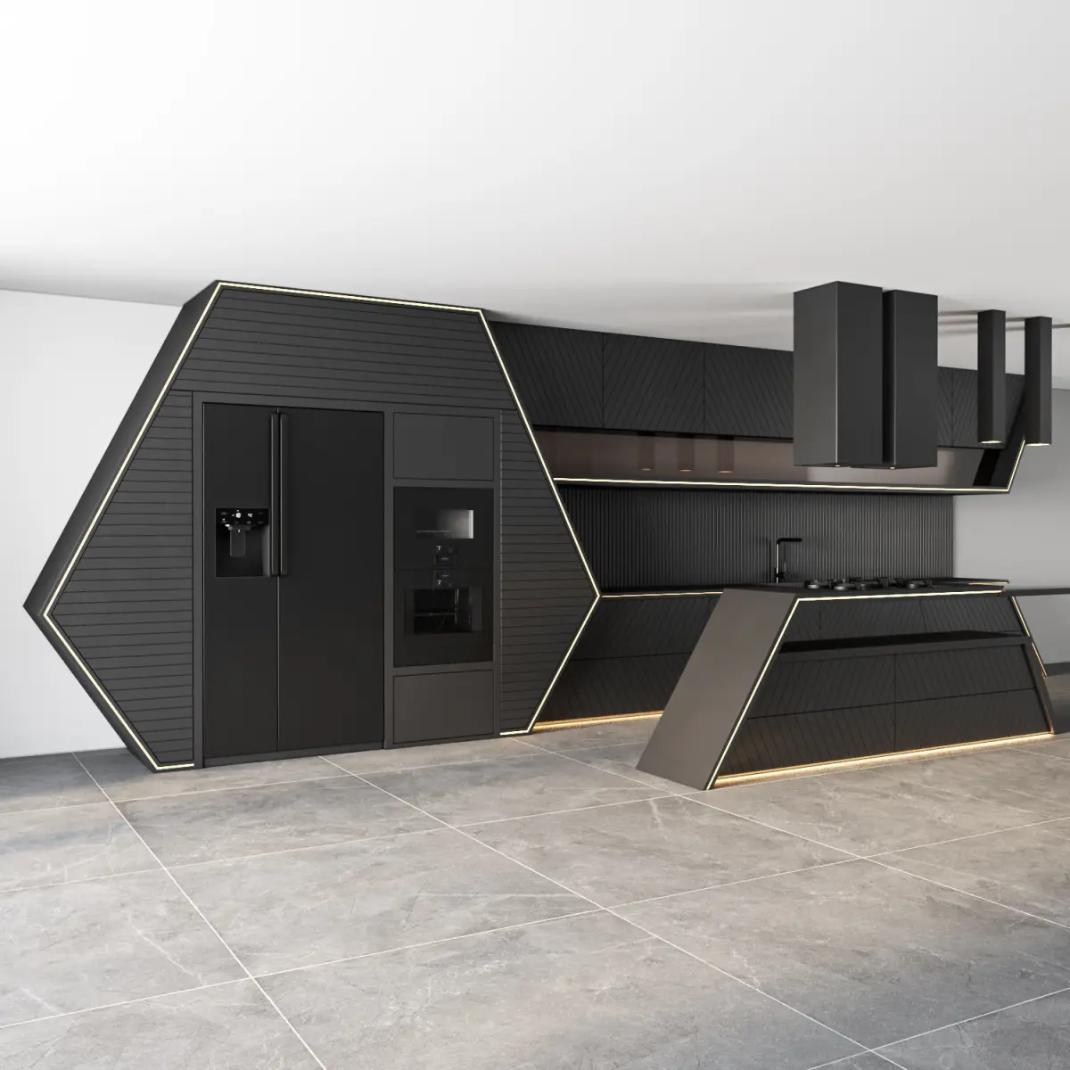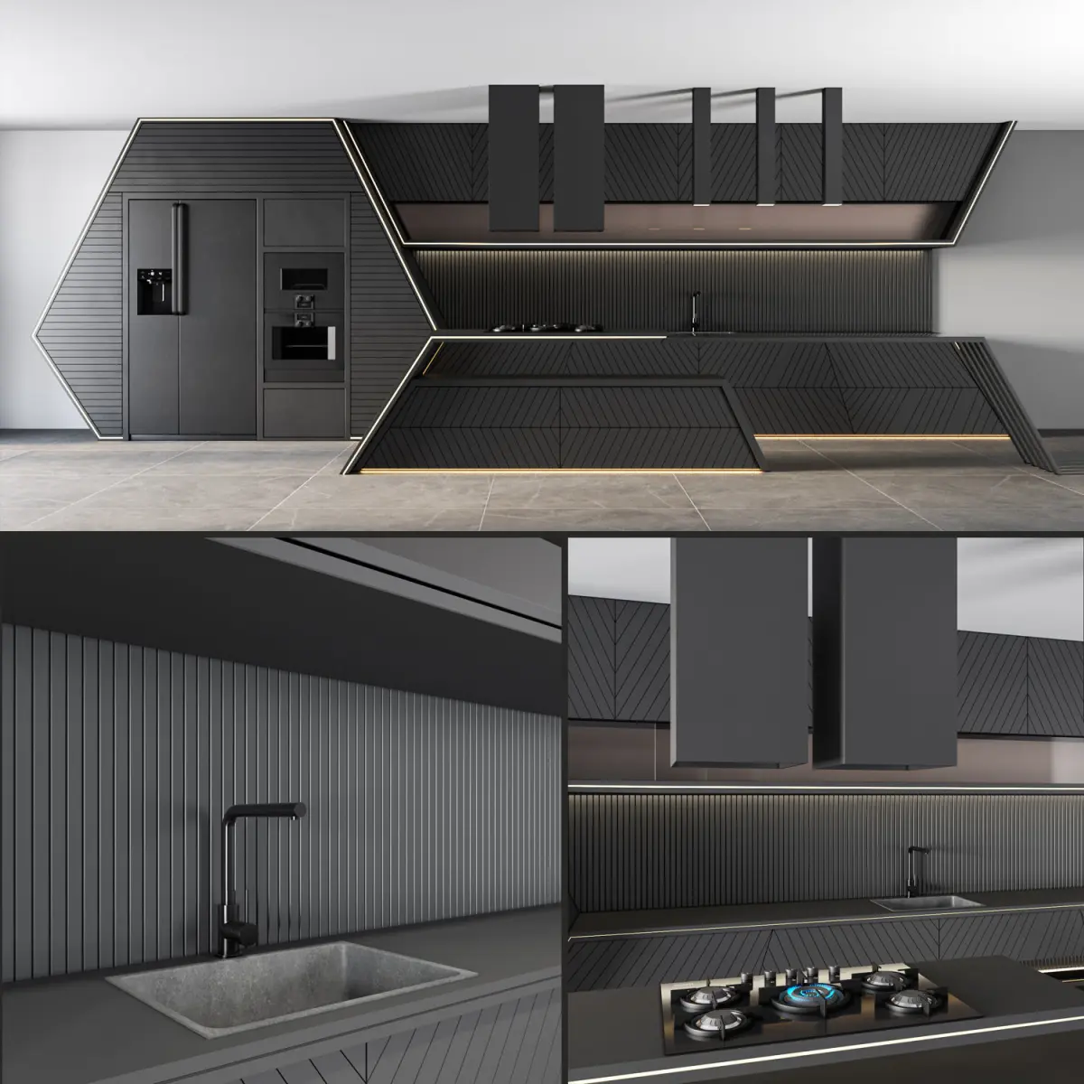 3d model: modern kitchen with Island for use in the interior in the style of modernDimensions: L710xW220x230cmIn the kitchen there are: cabinets, faucet, sink, hood, cooktop, oven.modeling in 3dmax 2019 and save as in max 2015 versionMaterials: Black wood, metal, glassAll cabinets are made as separate objects, and the kitchen is assembled into a group. The whole kitchen is very easy to edit in size.All parts are logically named to use easily .Do not include floor, ceiling and wallAll items are UVW mapped.objpolys :152695verts:165539