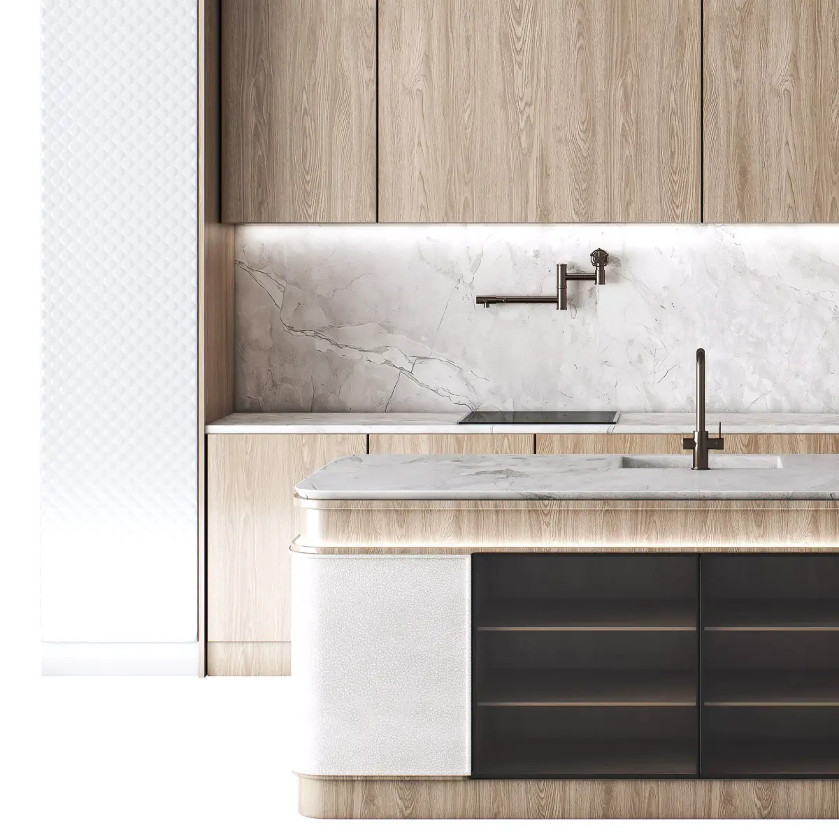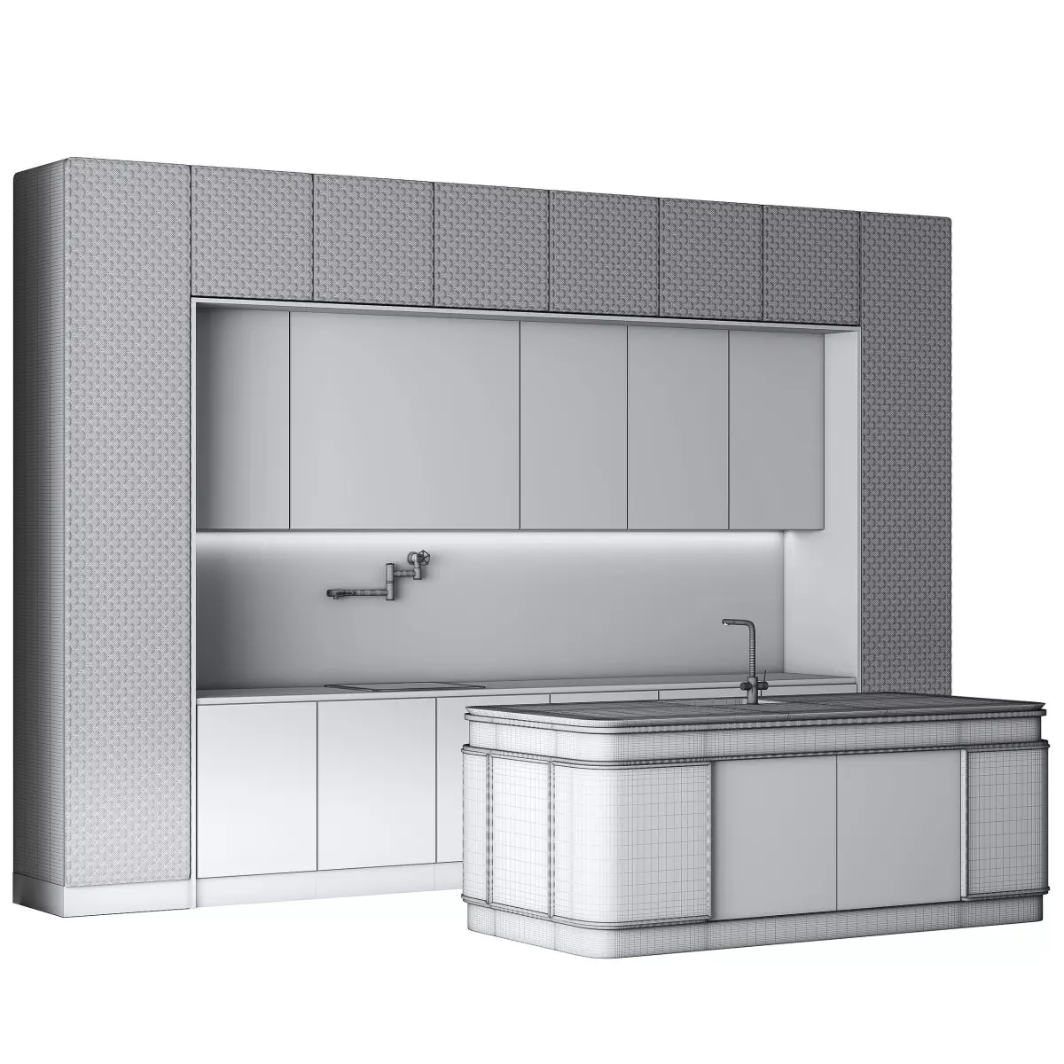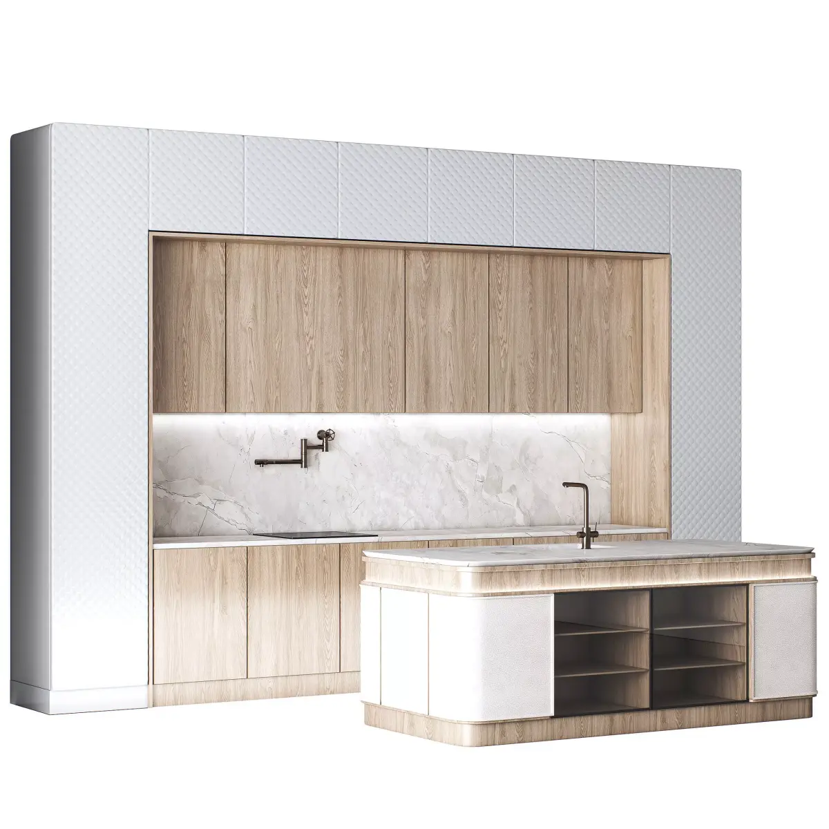 Elegant 3D model of a luxury modern kitchen featuring a combination of natural wood cabinets, marble backsplash, and metallic textured panels. The design includes a central kitchen island with rounded corners, open shelving, and premium material detailing. Perfect for interior visualization, architectural renders, and product presentations. The model is optimized for V-Ray and Corona Renderer, ensuring photorealistic results with accurate materials and lighting.