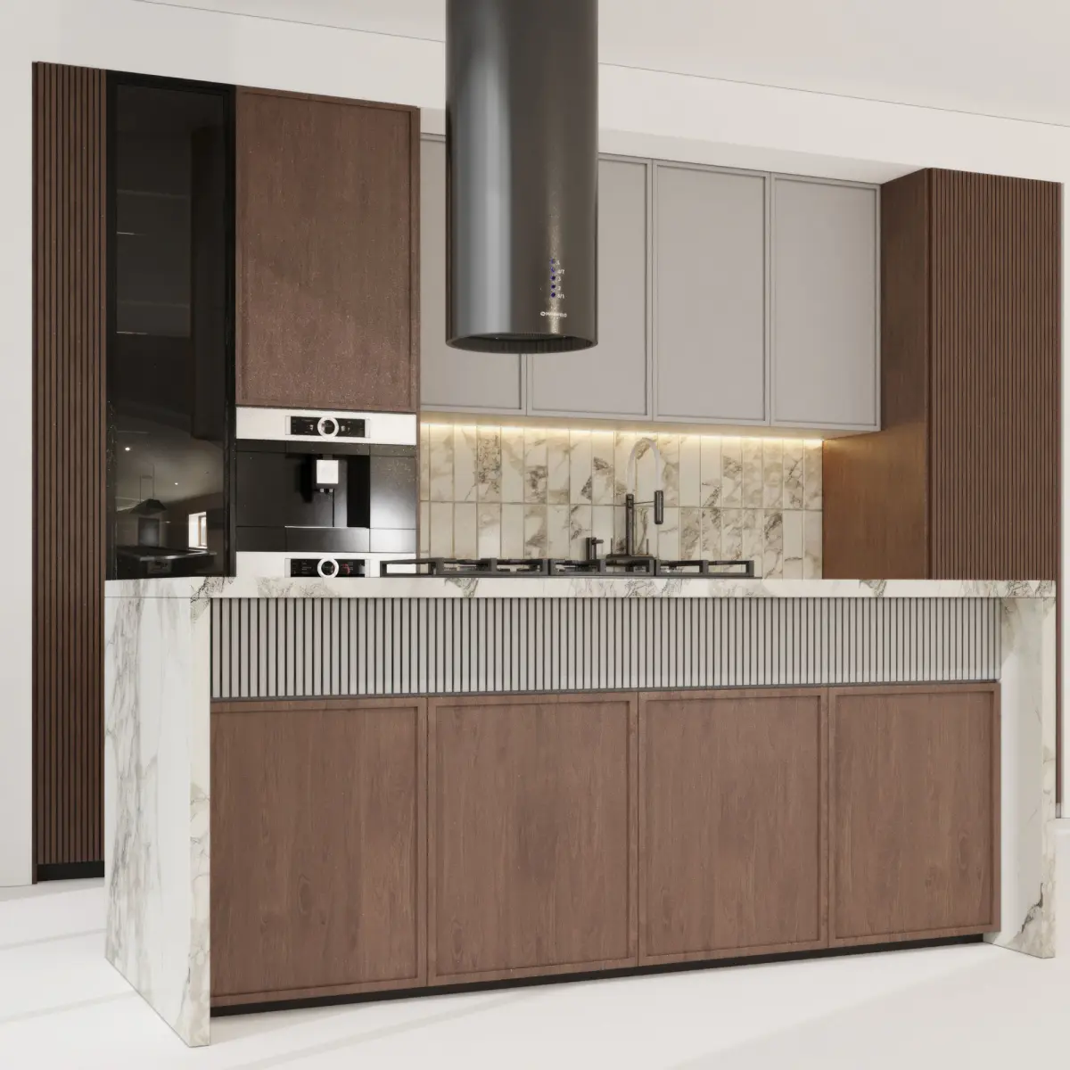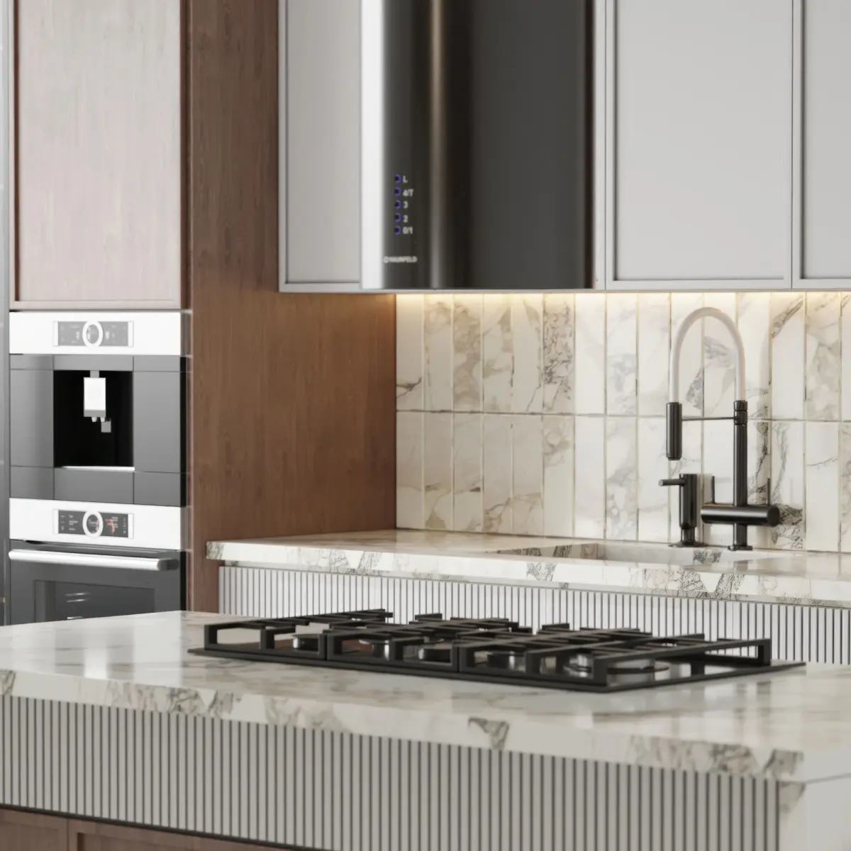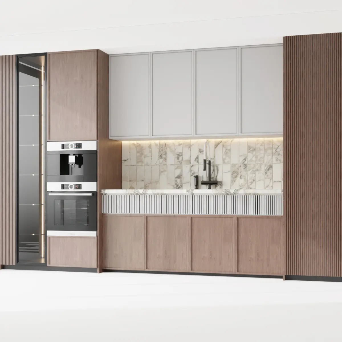 modeling in 3dmax 2018 and save as in max 2015 versionMaterials: white wood, stone, metal brass, mdf, glassAll cabinets are made as separate objects, and the kitchen is assembled into a group. The whole kitchen is very easy to edit in size.all appliances are separated and can be used.All parts are logically named to use easily.Do not include floor, ceiling and wallAll items are UVW mapped.Max 2015 - vray6Max 2015 - corona 6obj, fbxpolicy:117697verts:122349Those who work in V-Ray versions lower than 3.1, be careful, in the materials in the BRDF section there is Microfaset GTR ( GGX ), if your version is older than 3.1, then the BRDF field will be empty. Choose Blinn, Phong or Ward - whatever suits you best.