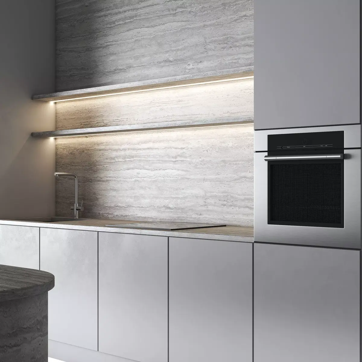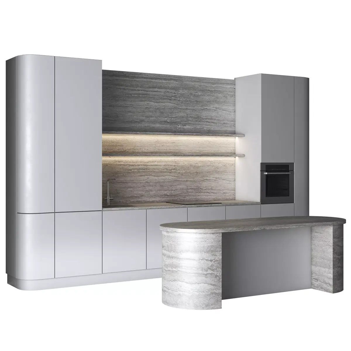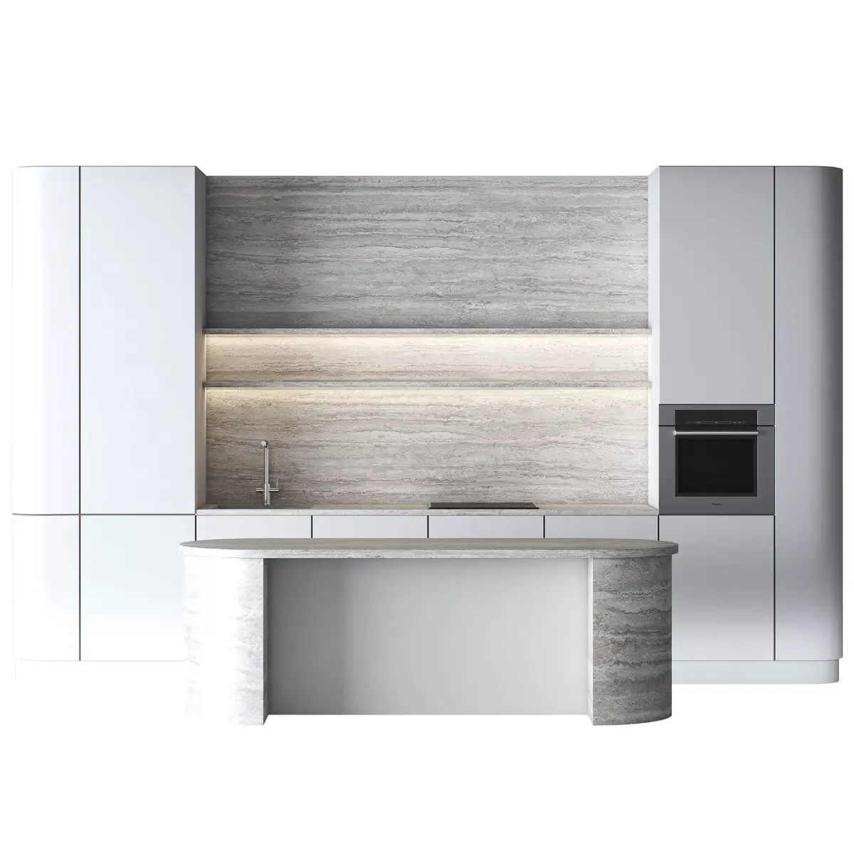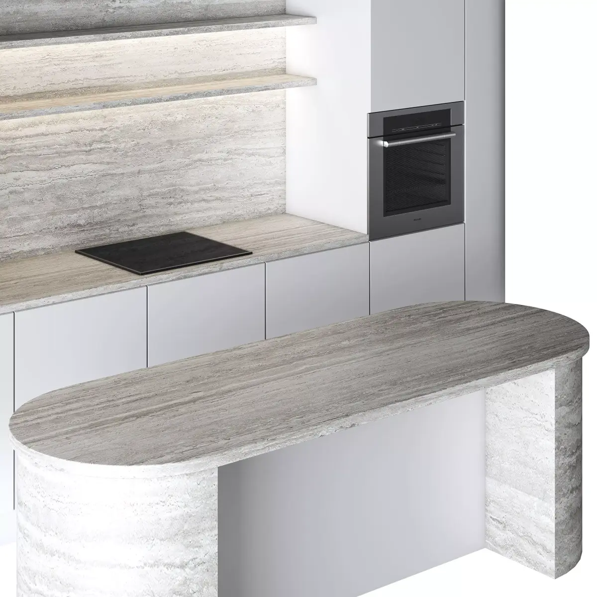 High-quality 3D model of a modern luxury kitchen featuring elegant stone textures, soft curved elements, and a minimalist layout. The design combines light gray cabinets with a natural travertine stone backsplash and countertop, creating a sophisticated and timeless look. The kitchen includes a curved island, built-in oven, and open shelves with warm accent lighting. Optimized for V-Ray and Corona Renderer, ideal for architectural visualization, interior renders, and design presentations.