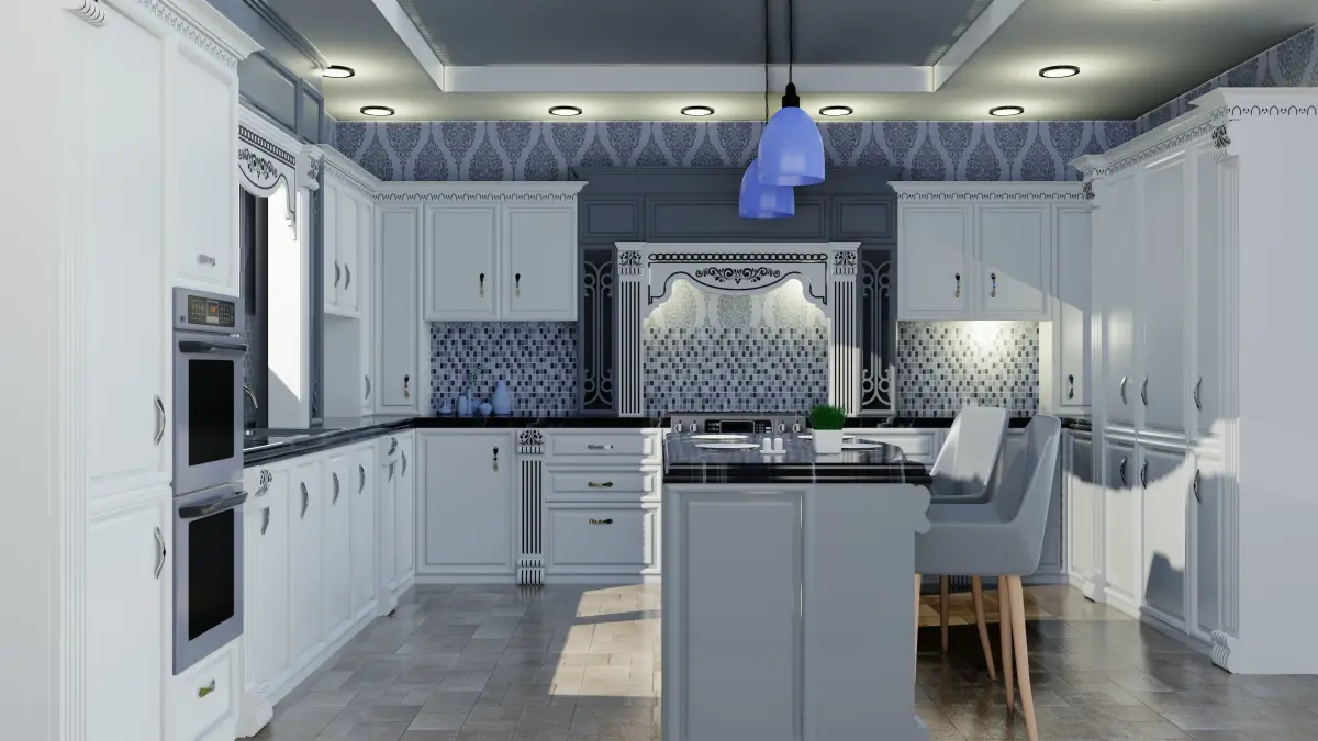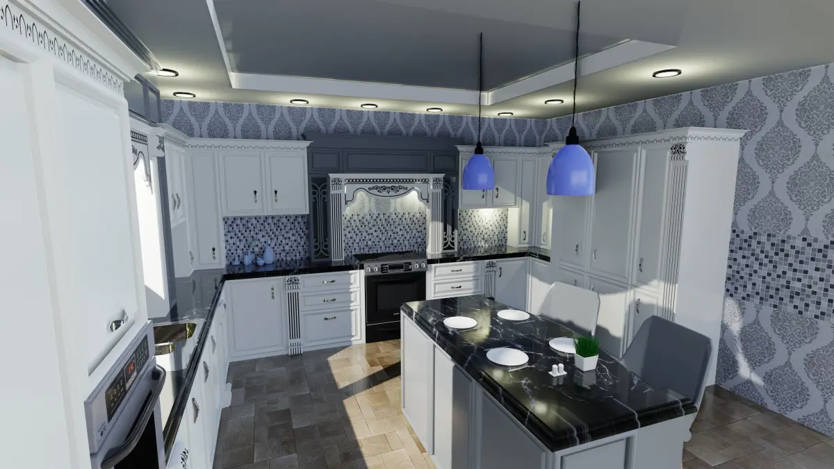 kitchen islandsinktapinduction hobbar stoolslemons and wooden deskhanging lampceiling lightskitchen furniturefloor: hexagonal tileswooden ceilingwindows All models are named properly.Textures are included.Blender version : 2.8, Cycles Format: blend, obj, fbx.