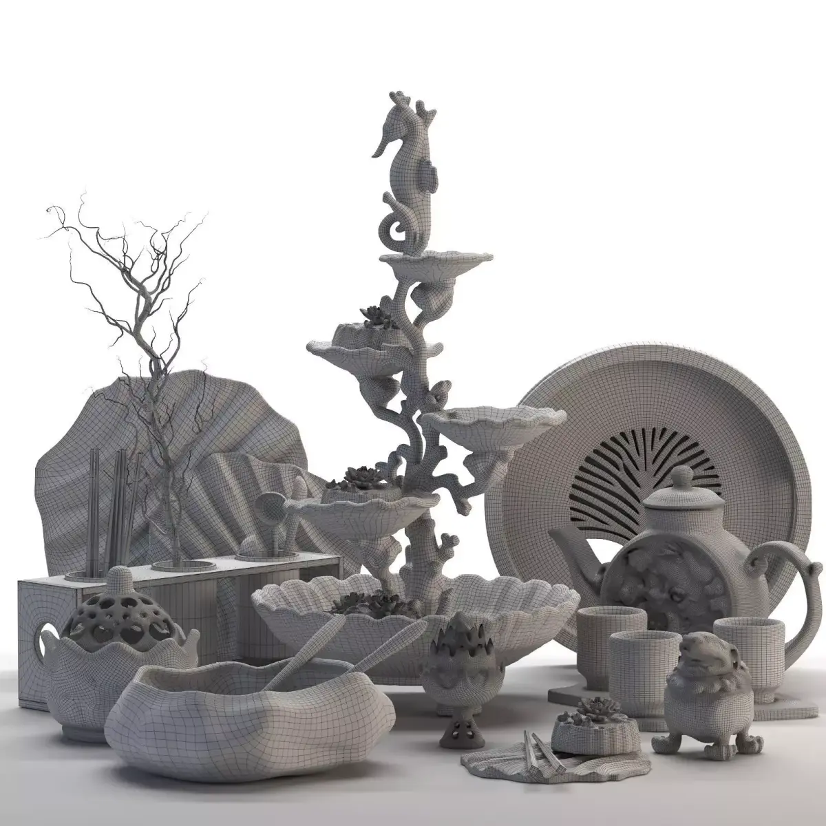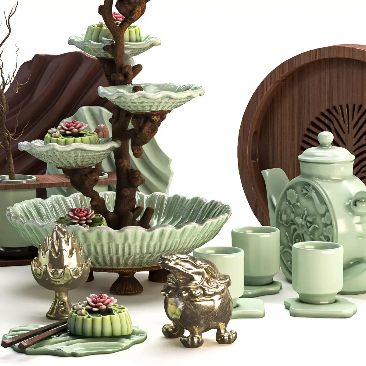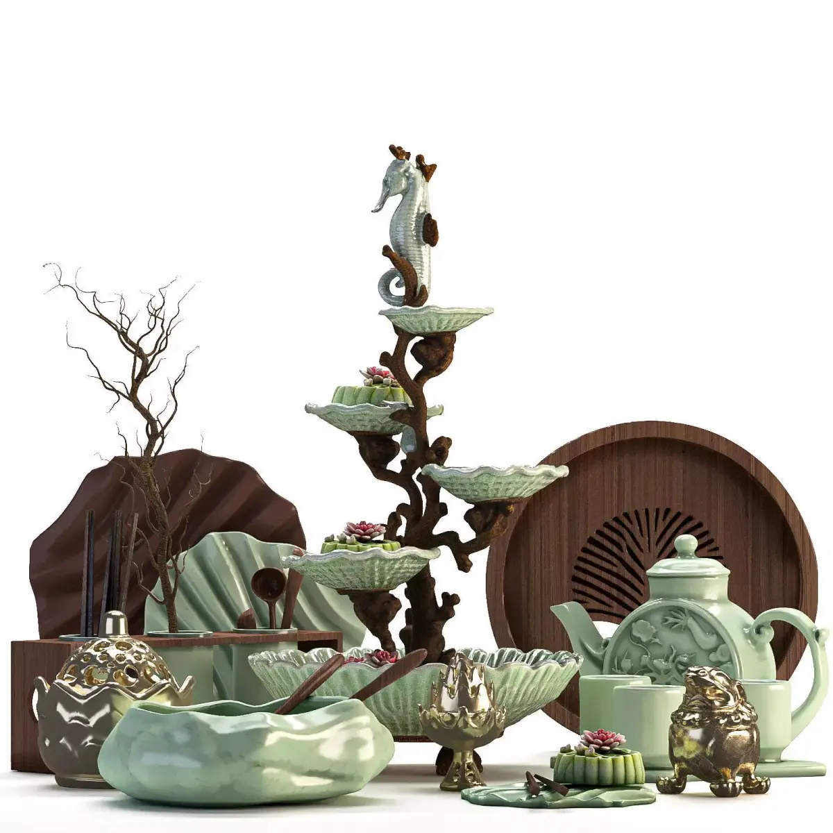 A detailed 3D model of a luxurious Chinese-style kitchen accessory set designed with a blend of traditional art and elegant craftsmanship. The collection features handcrafted elements such as teapots, trays, bowls, and decorative stands inspired by nature and Eastern aesthetics. The centerpiece, a seahorse-shaped serving stand surrounded by ceramic lotus flowers, adds a sophisticated and artistic touch to any interior visualization.