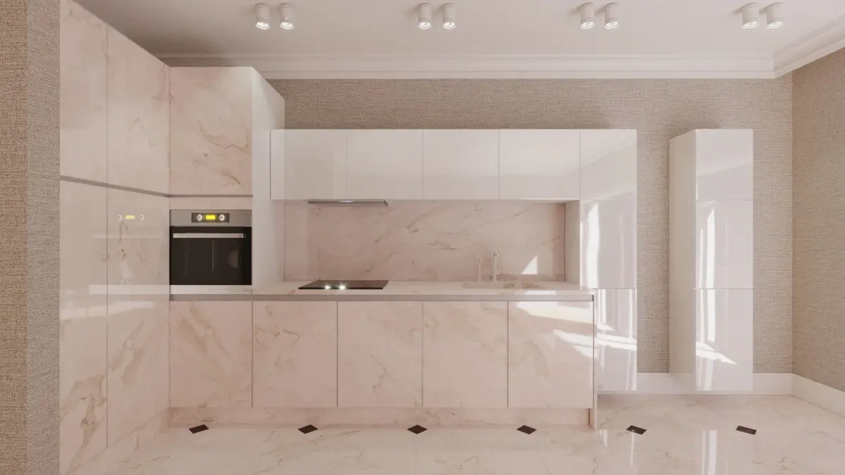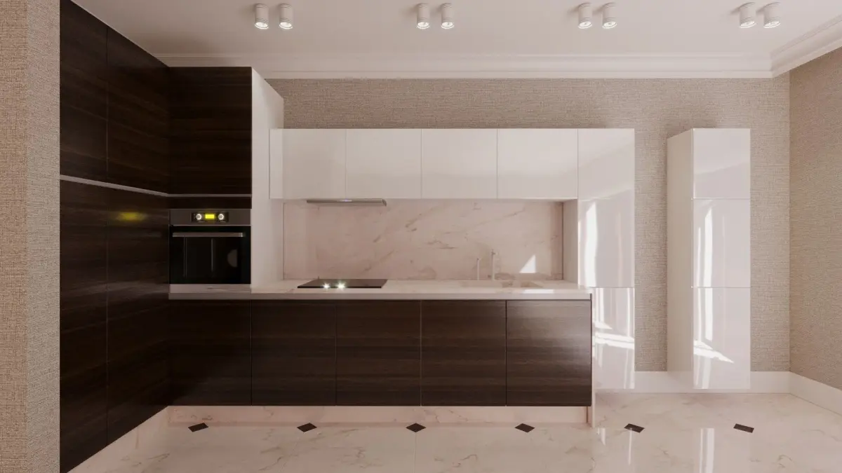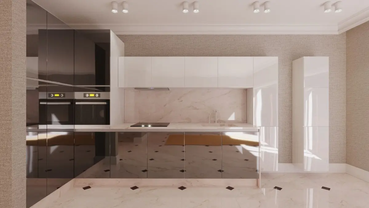 The kitchen include 4 fasade materials (gloss and matt marble, white gloss, white matt, wood, black mirror painting)