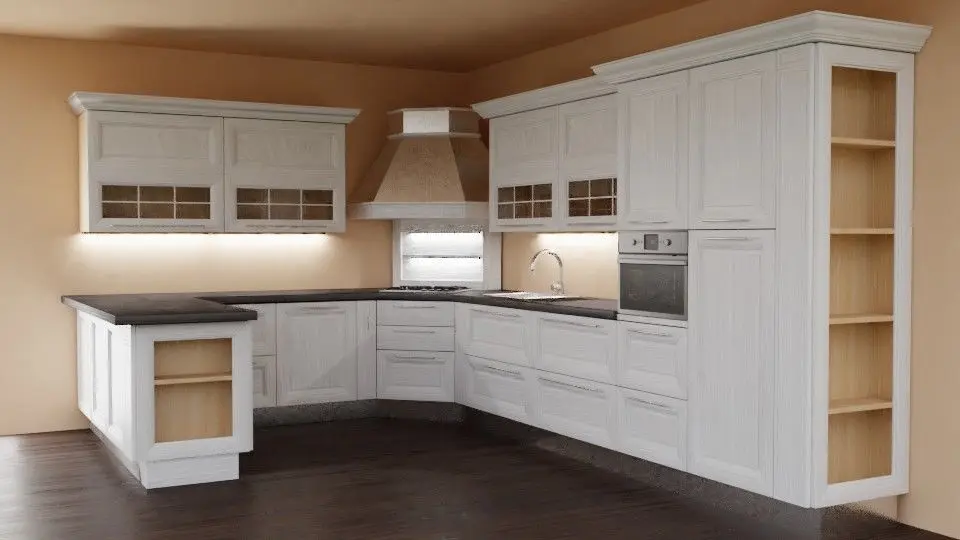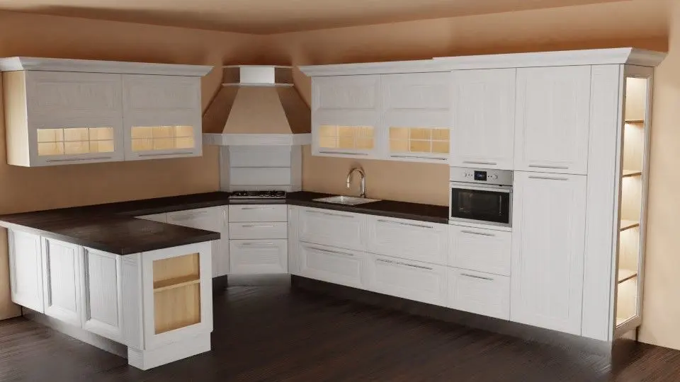 -- Layers -- Layer 1: kitchen, room, 1 camera Layer 2 to 5: point light, area light and emission material to generate daily light, electric, inside window wall cabinet, under wall cabinet. You can combine layers simoultaniously to get different illumination stiles.