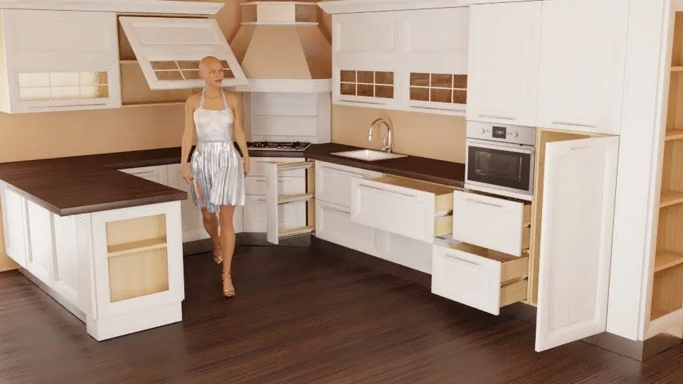 Modern kitchen. In this model you can open cabinet doors and drawers.