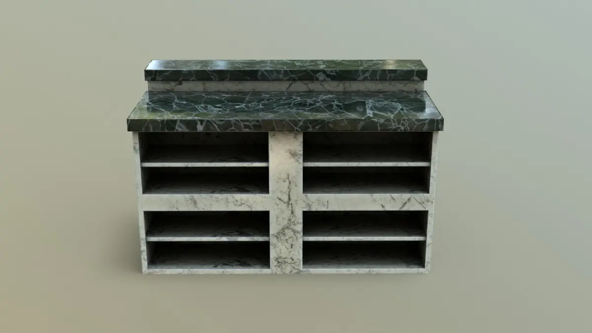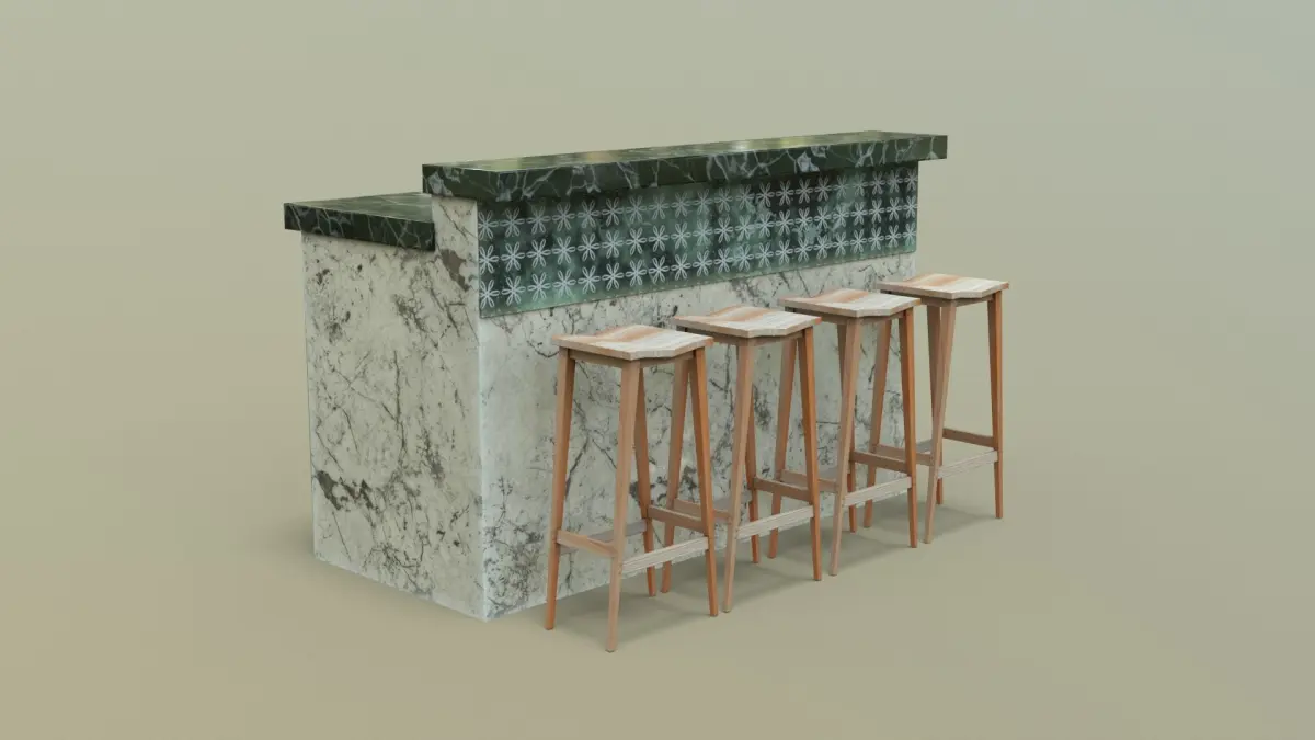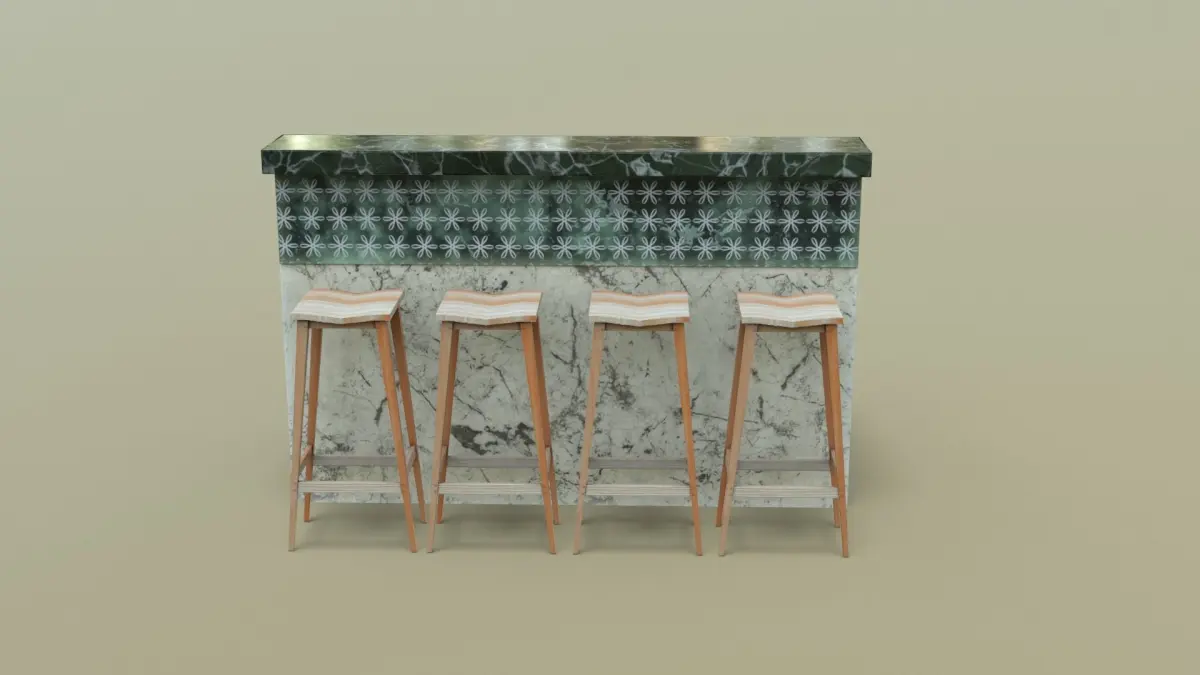 This is a 3d model of a Kitchen Counter with Stools. This model is ideal for interior visualizations, games, and movies. All textures are available in zip format. Created with Cinema 4D. Textured in substance painter, Rendered with Marmoset Toolbag 4. All objects UV unwrapped.