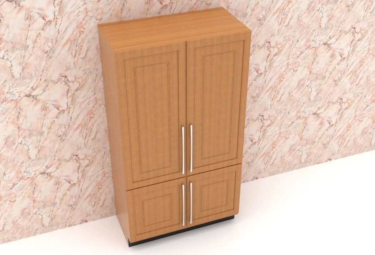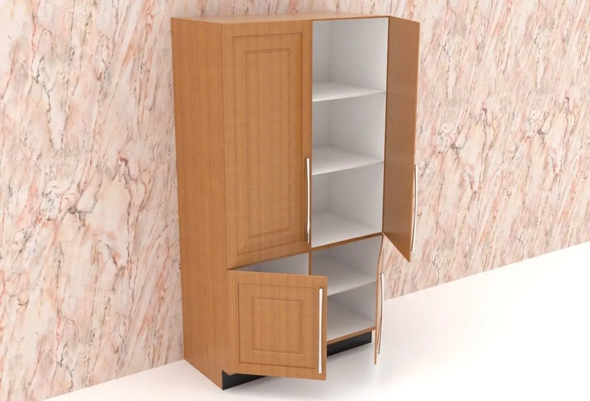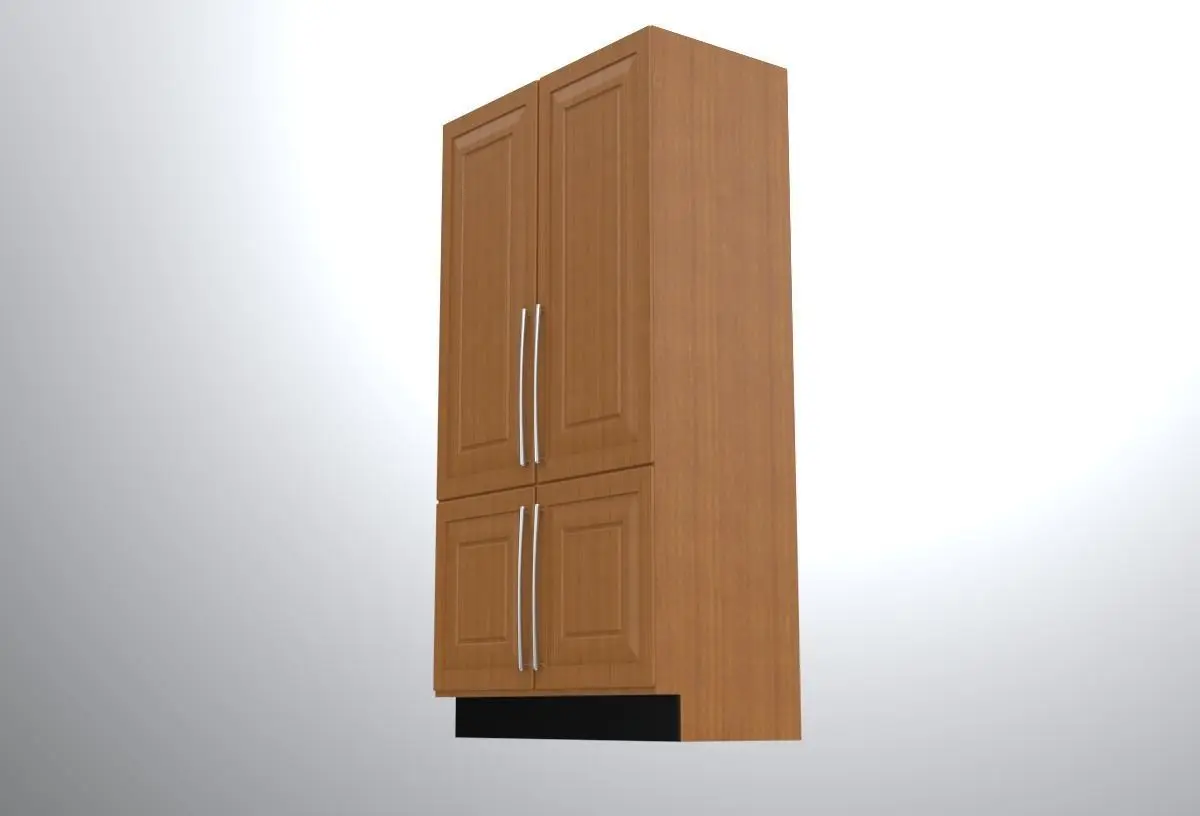 The design features a cherry veneer exterior with white internal liner/Shelves & finished with chrome handles. It works well with the Kitchen Sink and single/double cupboard units and hung cabinets that I have created. You can use them together to make a layout. I have also created a similar cabinet with glass doors, which is also available to download from this site.