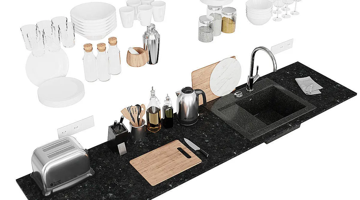 Set of decor and appliances for kitchen and kitchen island