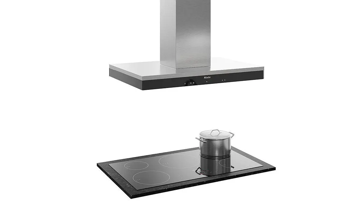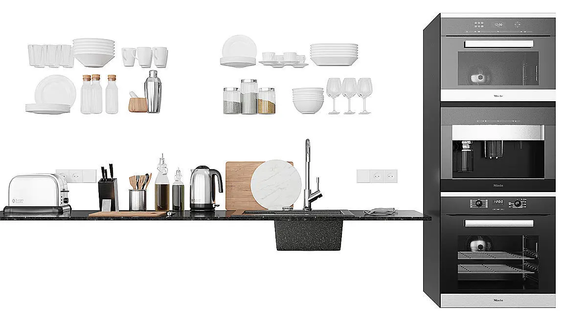 Built-in hood Miele + Island hood Miele Kitchen appliances Miele Sink Villeroy & boch Subway Crane Villeroy & boch Umbrella Switches and sockets Decor and tableware.