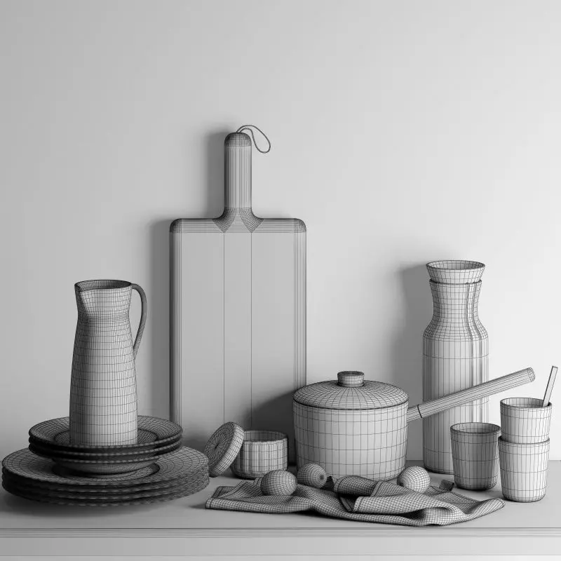 Highly detailed model of kitchen decoration set 1. Polygonal mesh. Archive contains: 3dsmax2014 3dsmax2011 OBJ FBXtextures Polys:105340 Verts:105421 Enjoy:)