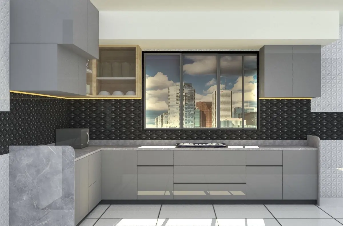 this model of modern kitchen is in basically three parts 1] base cabinets 2] mid height cabinets 3] over head cabinetsand it contain s model of some kitchen accessories such as gas burner , microwave oven , and kitchen set of plates and cup .