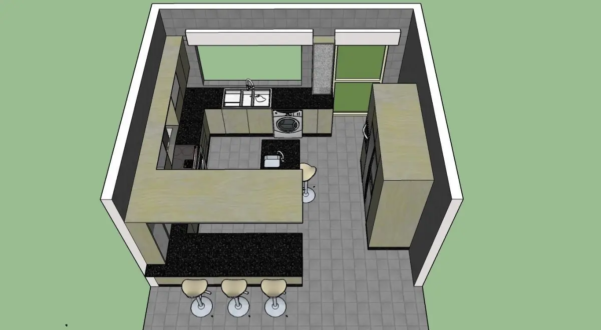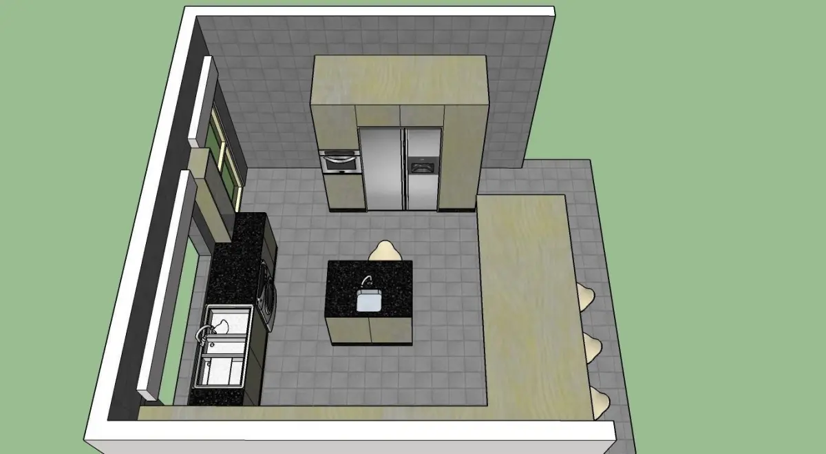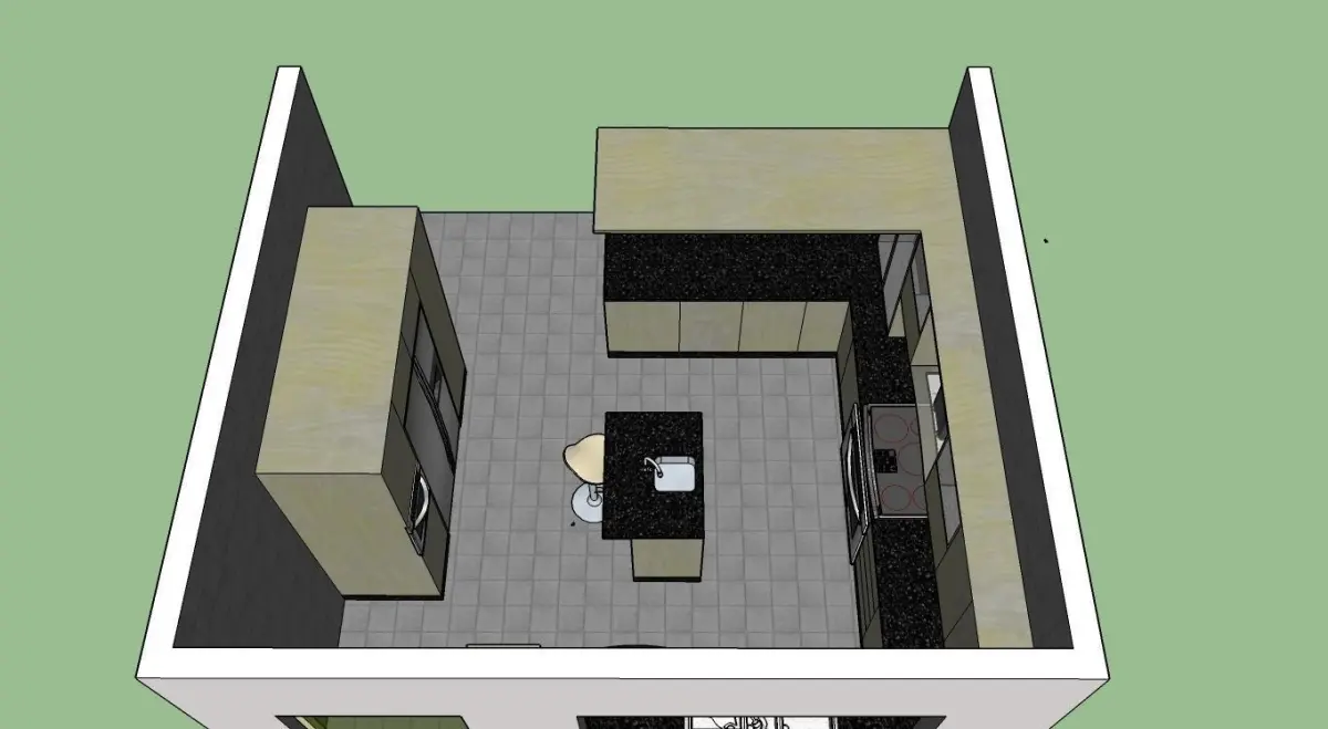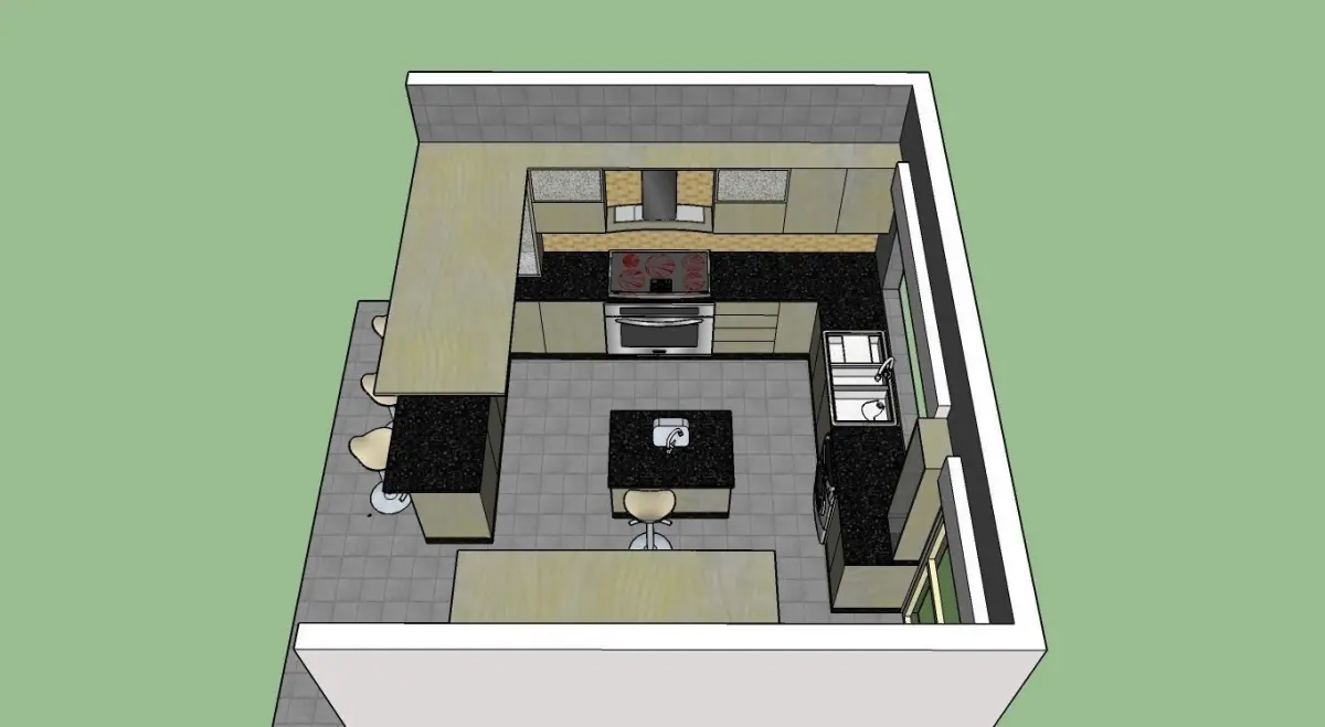 an american style kitchen, wooden and granite with an island, designed and 3d modeled to scale and standards by architect Amr Almasri @ Calligraphy Art Applications