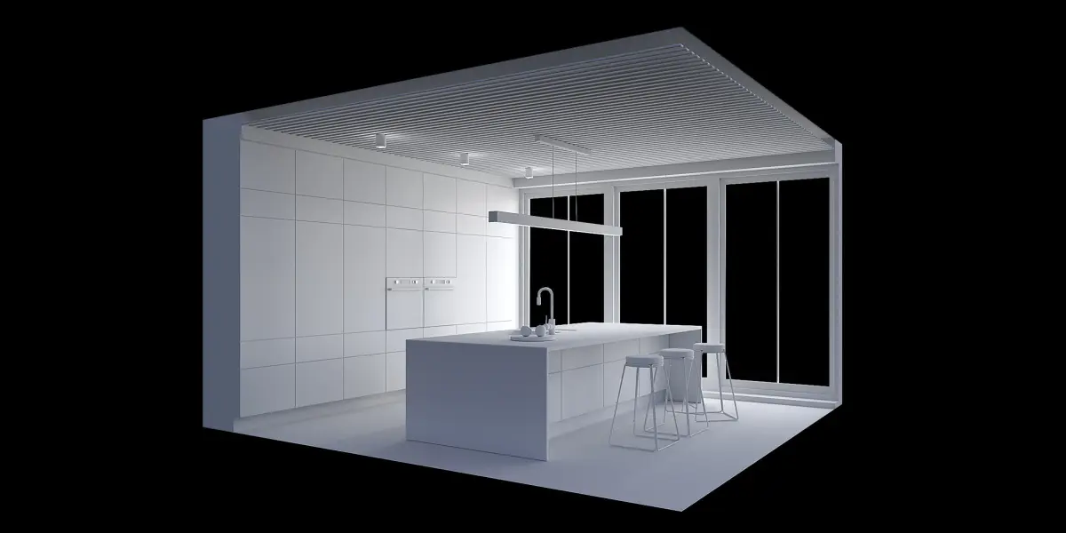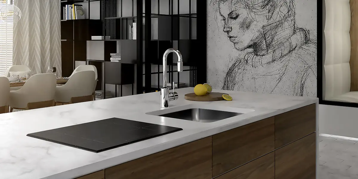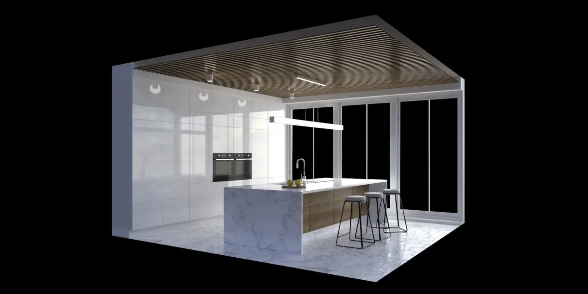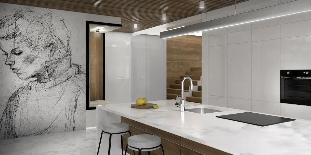 Beautiful, spacious kitchen. In the middle of the kitchen there is island with bar stools.Modern combination of materials: wood and marble.