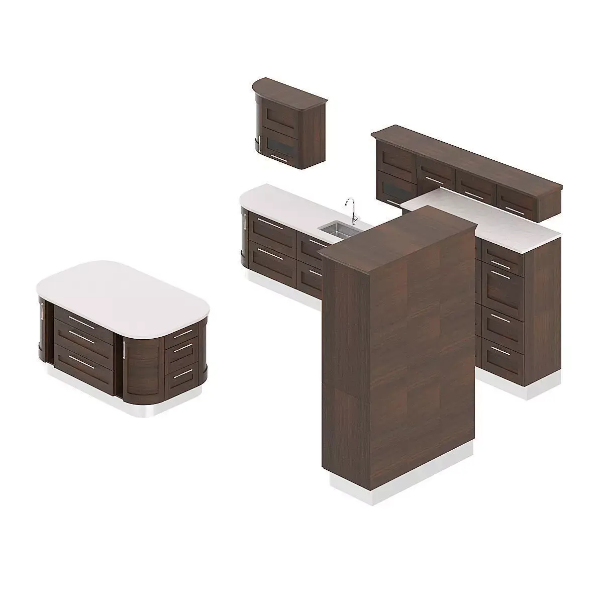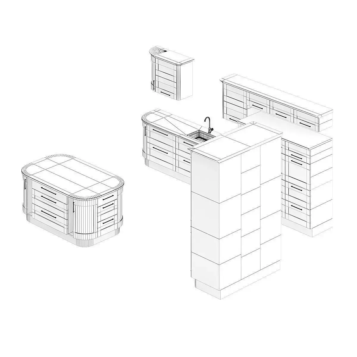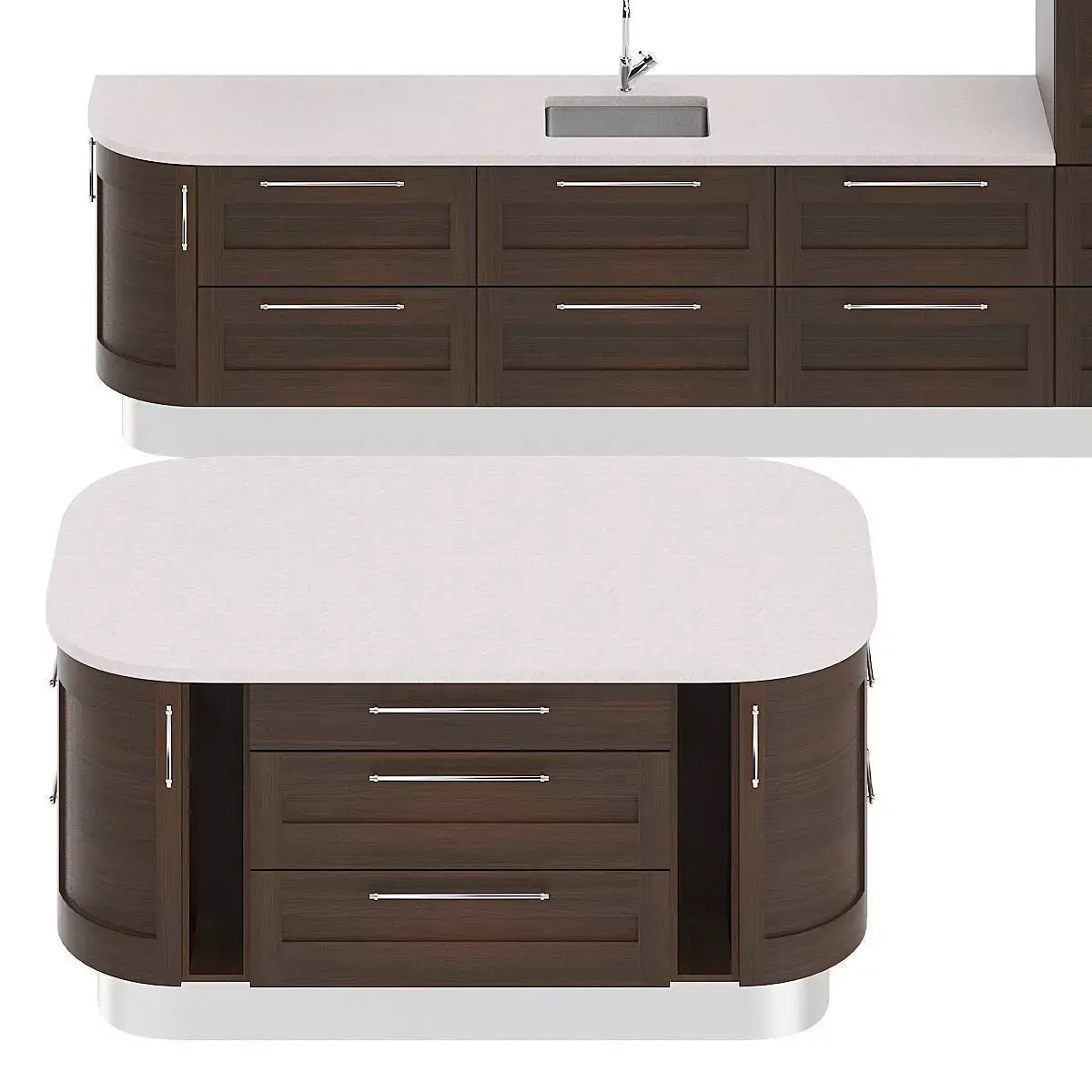 3d model of rounded kitchen furniture set with dark wooden fronts, light marble countertop and brushed metal bottom. Compatible with 3ds max 2010 or higher and many others.
