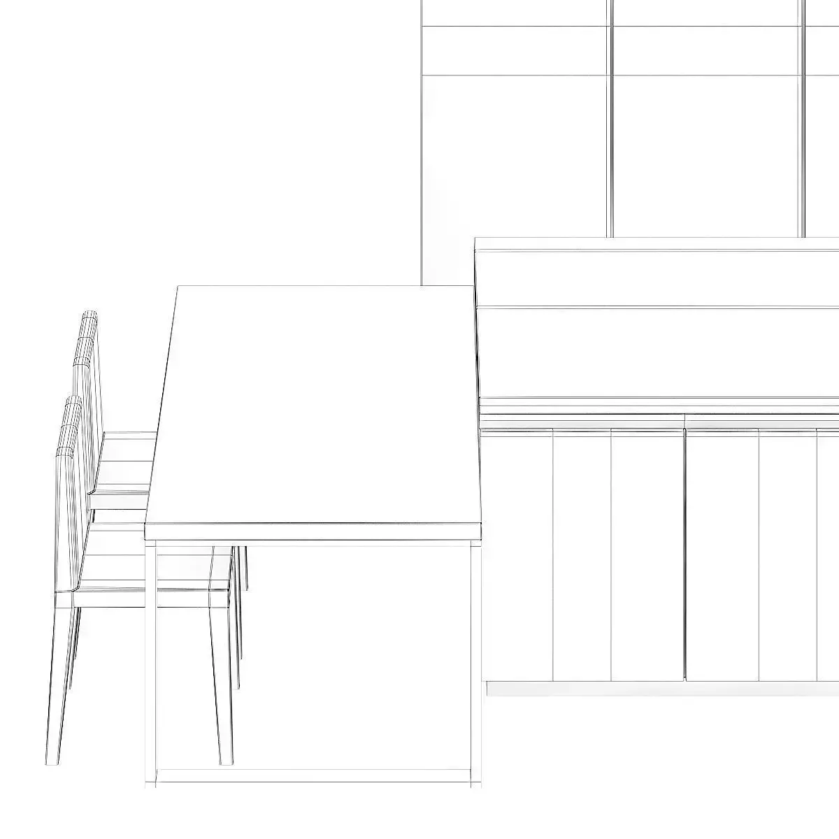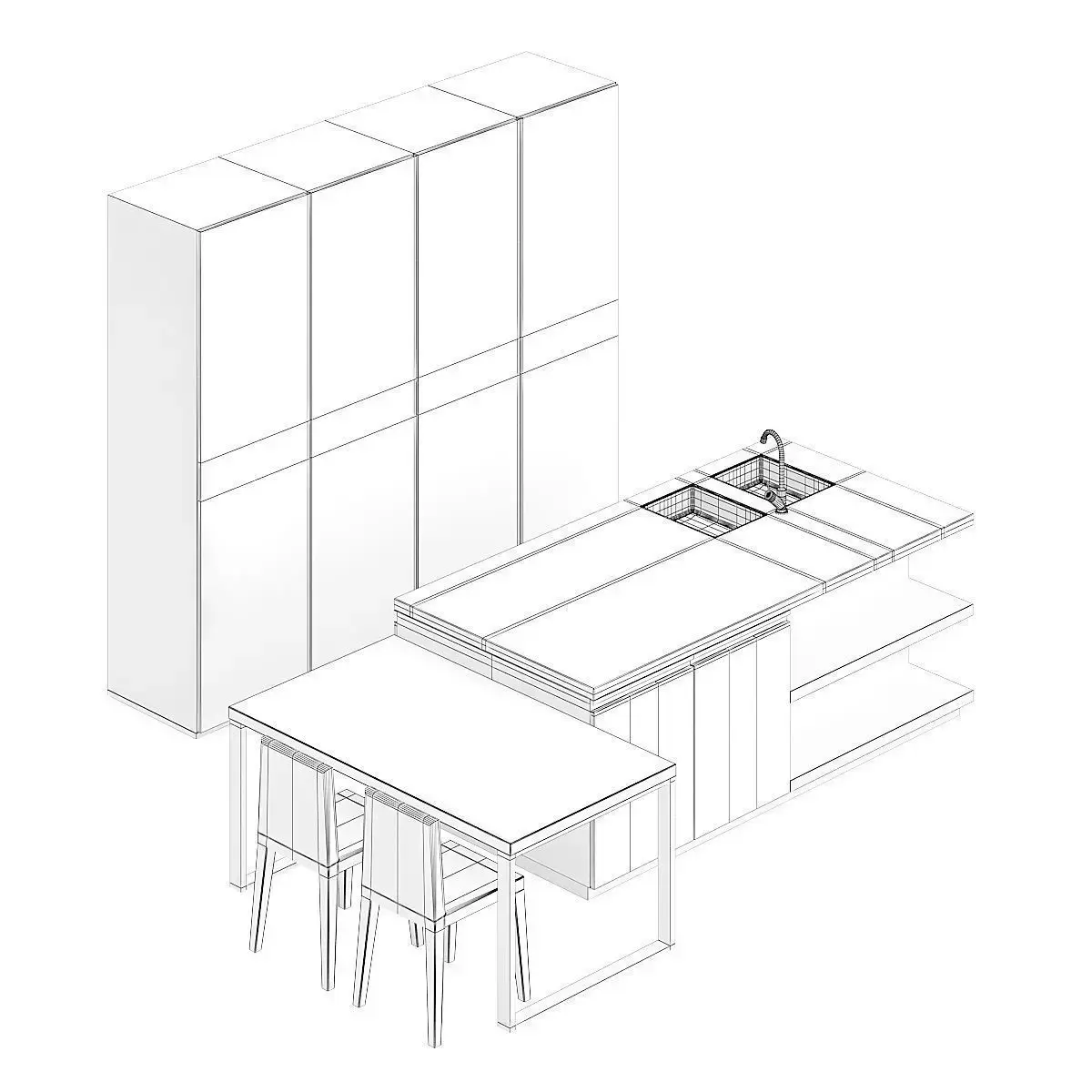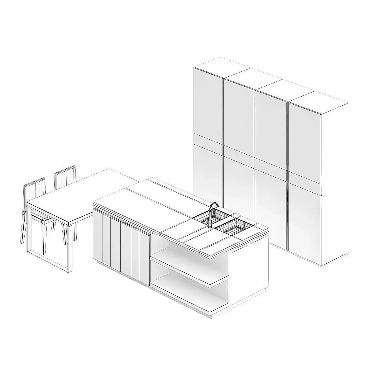 3d model of white kitchen furniture set with an island with some wooden elements. It also has a table with two black chairs. Compatible with 3ds max 2010 or higher and many others.