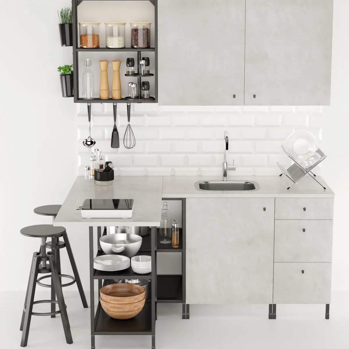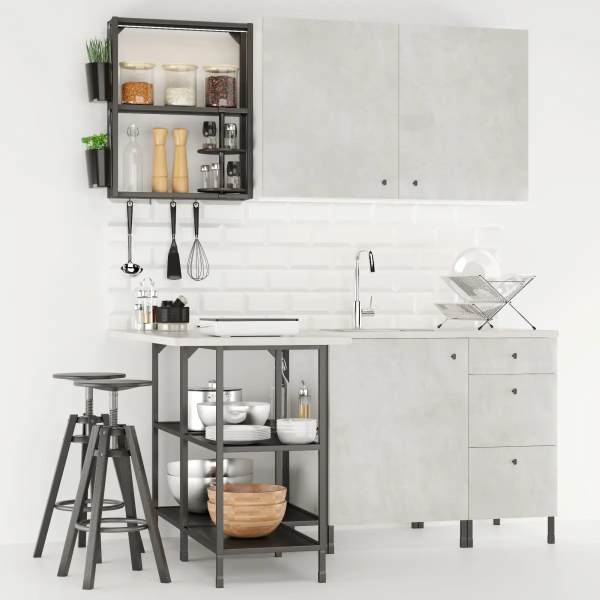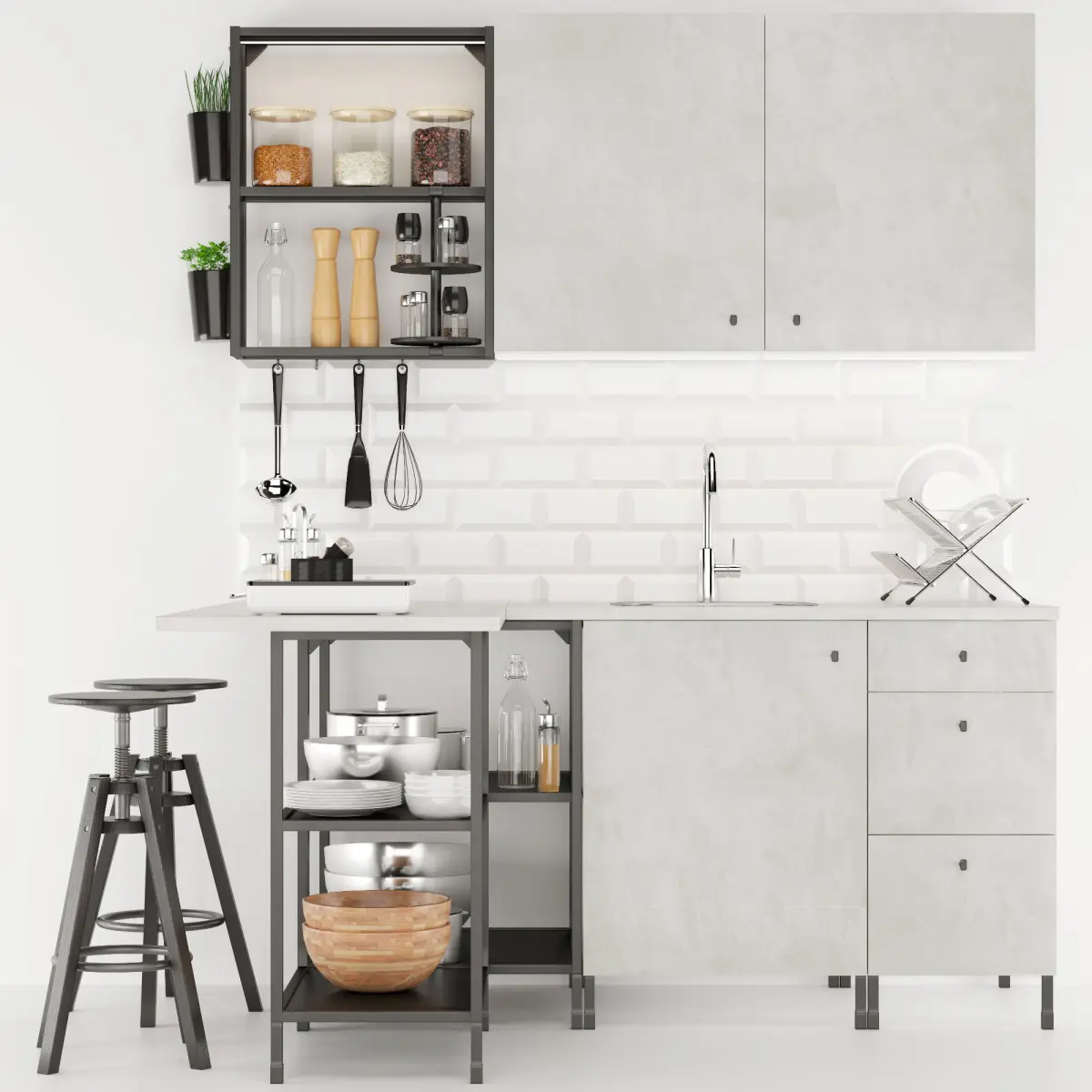 In the scene were used:Frame with shelf ENHETWall-mounted frame with shelves ENHETDoors under concrete ENHETCountertop under concrete EKBACKENPortable induction plate TilredaKitchen Mixer with retractable hose ELMARENSingle mortise sink FundigDryer for dishes KVOTLED Countertops OMLOPPContainer SKATTÅNRotating Shelf ENHET EnherheetBar Chair DALFREDAnd other kitchen accessories.