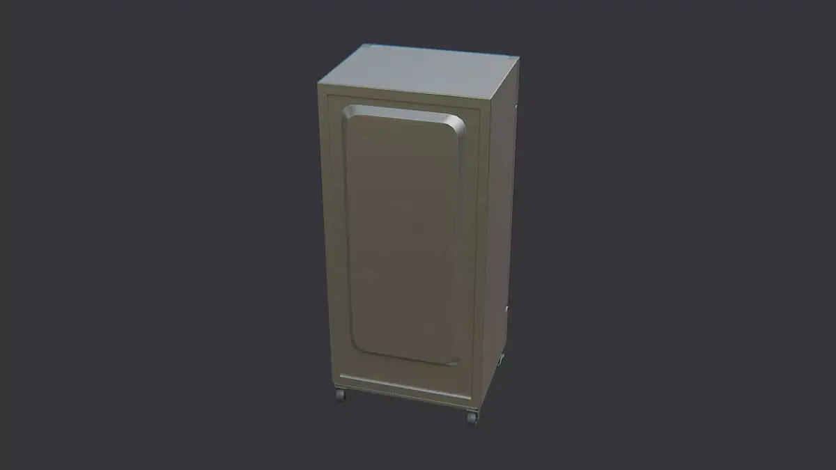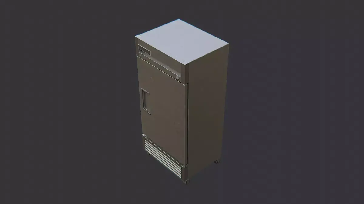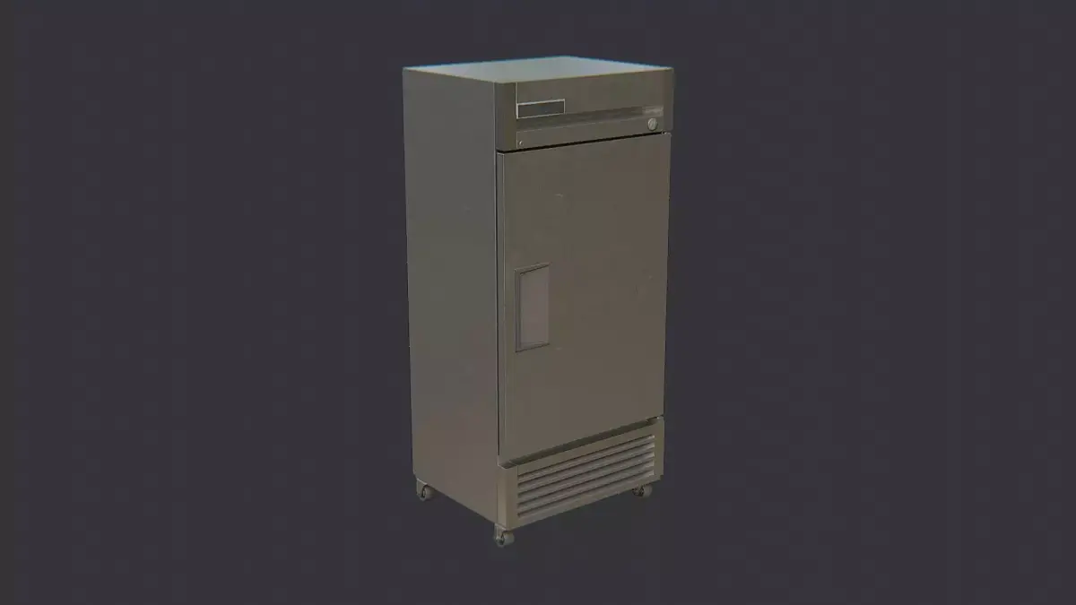 This freestanding industrial refrigerator features a tall single-door cabinet, a recessed handle, and a vented base for realistic ventilation details. The steel-gray finish provides a sturdy kitchen appliance look suitable for cafes, offices, studios, or home kitchens in architectural renders. Ideal for product visuals and credible cold-storage scenes.
