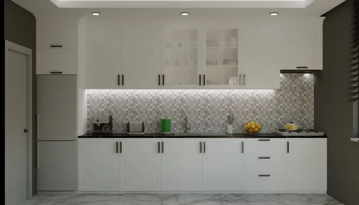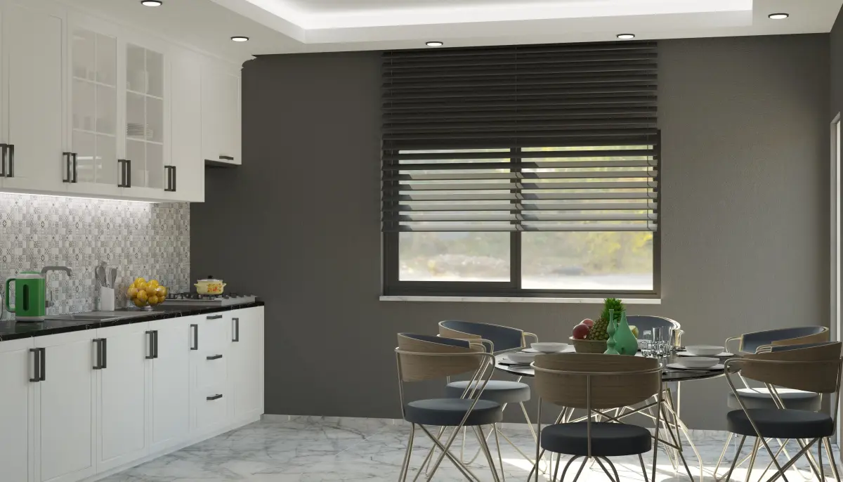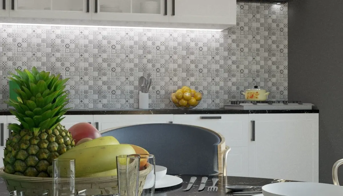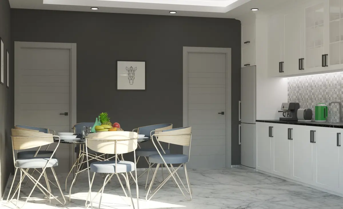 This is a detailed photo - realistic model of a modern kitchen interior including dining area and a large range of kitchen objects and accessories.