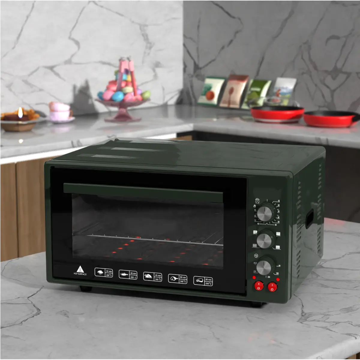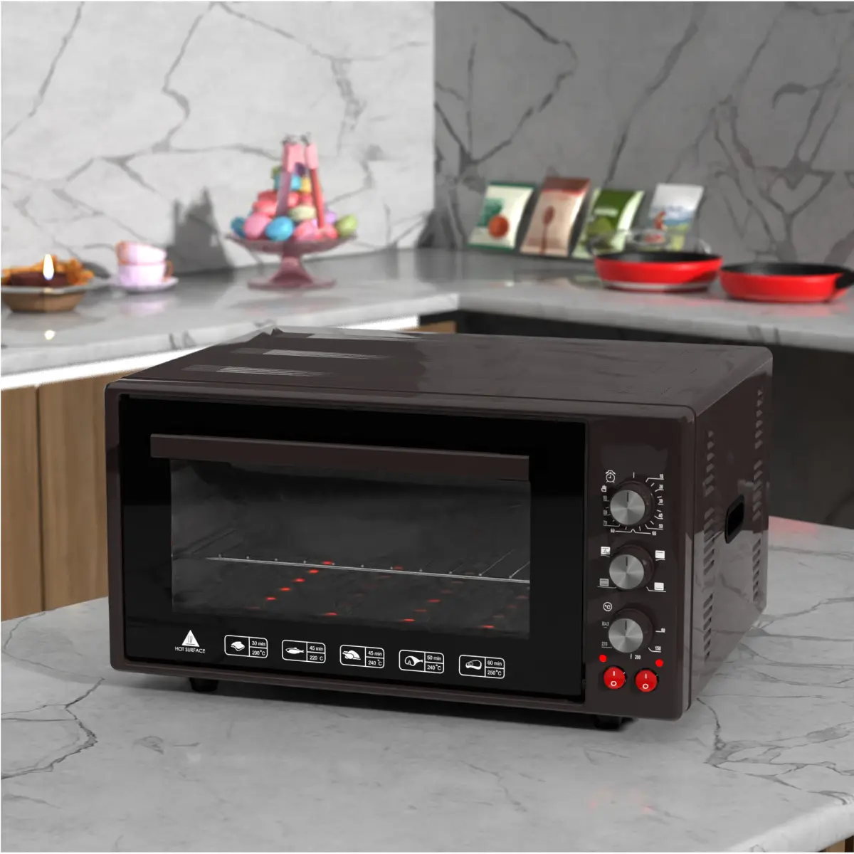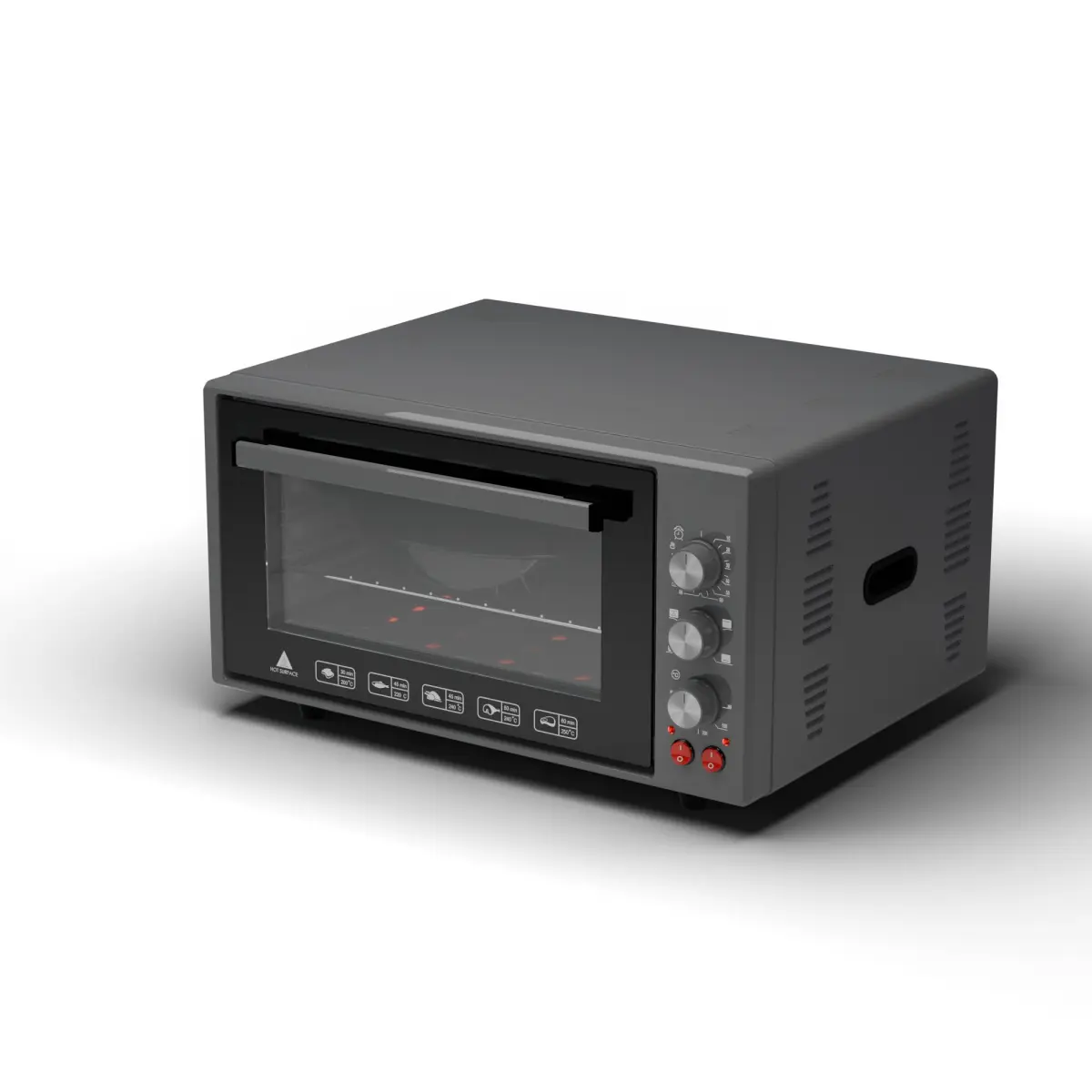 - Body: Rectangular or slightly rounded at the corners to mimic the compact and space-saving design of a mini oven. The body is typically made of metal (often simulated as stainless steel, black, or white) and may have a smooth texture with visible seams.