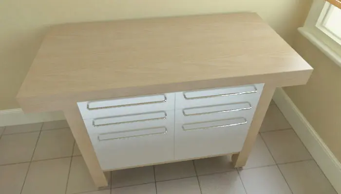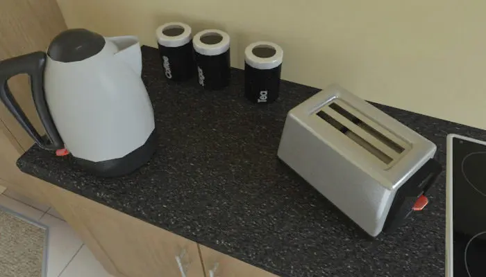 Washing machine/dish washer/sink unitOven and hob unitKitchen cabinet draws unit (steel)Kitchen cabinet draws unit (wood)Kitchen cabinet sink unitRange cooker unit2 FridgesKettleCoffee, tea and sugar potToasterCube lampPizza boxSoda can2 Ash traysFloor tilesWall